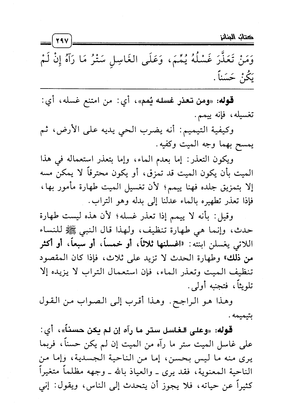 قوله: «وعلى الغاسل ستر ما رآه إن لم يكن حسناً»، أي: على غاسل الميت ستر ما رآه من الميت إن لم يكن حسناً، فربما يرى منه ما ليس بحسن، إما من الناحية الجسدية، وإما من الناحية المعنوية، فقد يرى ـ والعياذ بالله ـ وجهه مظلماً متغيراً كثيراً عن حياته، فلا يجوز أن يتحدث إلى الناس، ويقول: إني