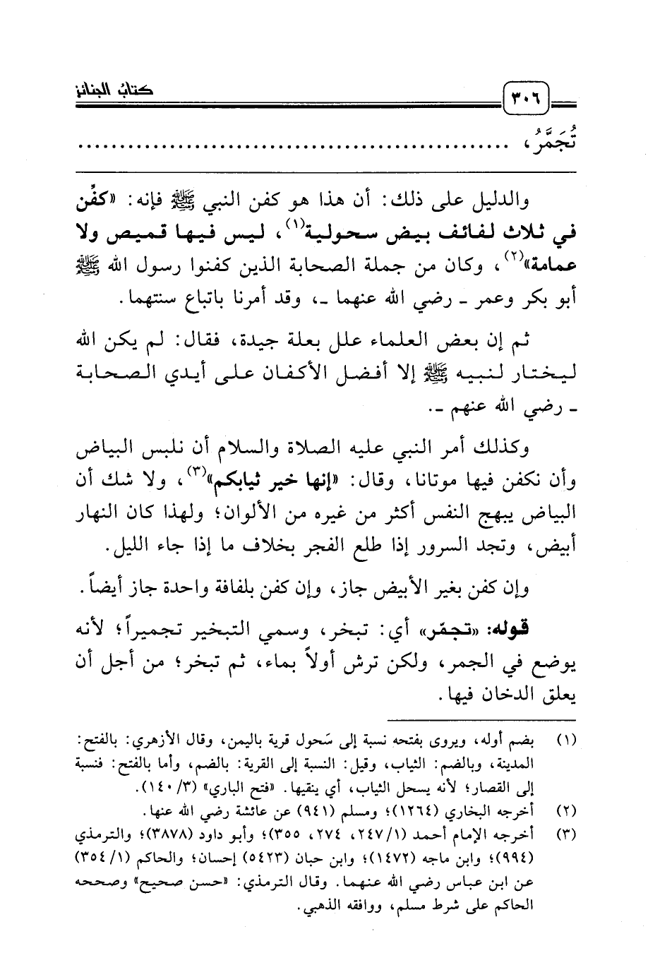 والدليل على ذلك: أن هذا هو كفن النبي صلّى الله عليه وسلّم فإنه: «كفِّن في ثلاث لفائف بيض سحولية (¬1)، ليس فيها قميص ولا عمامة» (¬2)، وكان من جملة الصحابة الذين كفنوا رسول الله صلّى الله عليه وسلّم أبو بكر وعمر ـ رضي الله عنهما ـ، وقد أمرنا باتباع سنتهما.