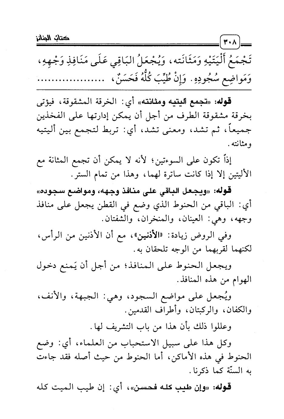 تَجْمَعُ أَلْيَتَيْهِ وَمَثَانَته، وَيُجْعَلُ البَاقِي عَلَى مَنَافِذِ وَجْهِهِ، وَمَواضِع سُجُودِهِ. وَإِنْ طُيِّبَ كُلُّهُ فَحَسَنٌ، .............