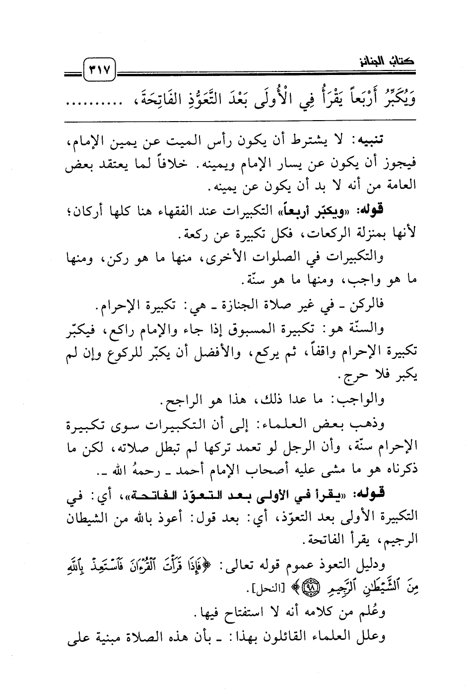 وَيُكَبِّرُ أَرْبَعاً يَقْرَأُ فِي الأُْولَى بَعْدَ التَّعَوُّذِ الفَاتِحَةَ، ...........