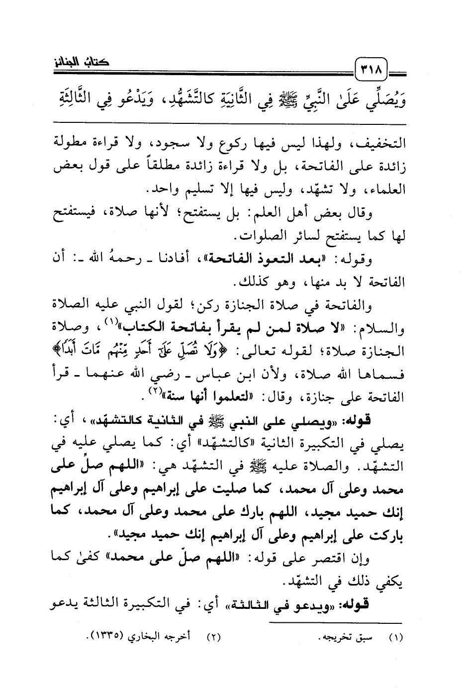 قوله: «ويصلي على النبي صلّى الله عليه وسلّم في الثانية كالتشهّد»، أي: يصلي في التكبيرة الثانية «كالتشهّد» أي: كما يصلي عليه في التشهّد. والصلاة عليه صلّى الله عليه وسلّم في التشهّد هي: «اللهم صلِّ على محمد وعلى آل محمد، كما صليت على إبراهيم وعلى آل إبراهيم إنك حميد مجيد، اللهم بارك على محمد وعلى آل محمد، كما باركت على إبراهيم وعلى آل إبراهيم إنك حميد مجيد».