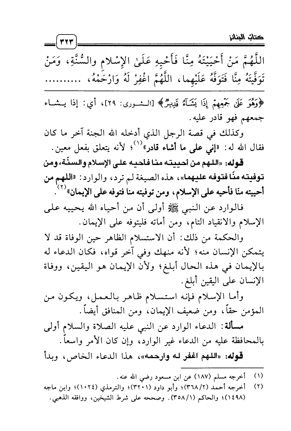 قوله: «اللهم من أحييته منا فأحيه على الإسلام والسنّة، ومن توفيته منّا فتوفه عليهما»، هذه الصيغة لم ترد، والوارد: «اللهم من أحييته منّا فأحيه على الإسلام، ومن توفيته منا فتوفه على الإيمان» (¬2).