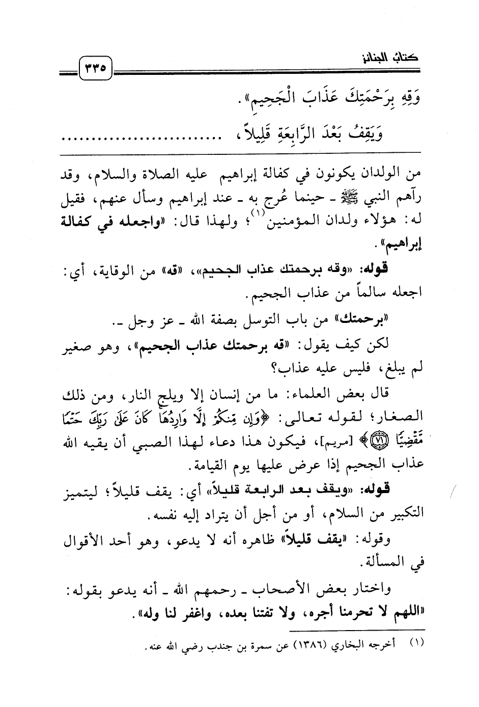 قال بعض العلماء: ما من إنسان إلا ويلج النار، ومن ذلك الصغار؛ لقوله تعالى: {وَإِنْ مِنْكُمْ إِلاَّ وَارِدُهَا كَانَ عَلَى رَبِّكَ حَتْمًا مَقْضِيًّا *} [مريم]، فيكون هذا دعاء لهذا الصبي أن يقيه الله عذاب الجحيم إذا عرض عليها يوم القيامة.