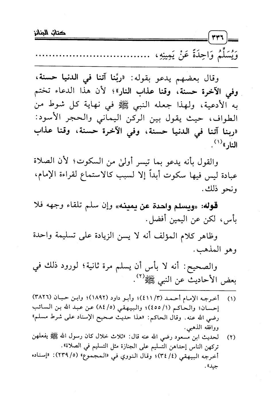 وقال بعضهم يدعو بقوله: «ربَّنا آتنا في الدنيا حسنة، وفي الآخرة حسنة، وقنا عذاب النار»؛ لأن هذا الدعاء تختم به الأدعية، ولهذا جعله النبي صلّى الله عليه وسلّم في نهاية كل شوط من الطواف، حيث يقول بين الركن اليماني والحجر الأسود: «ربنا آتنا في الدنيا حسنة، وفي الآخرة حسنة، وقنا عذاب النار» (¬1).