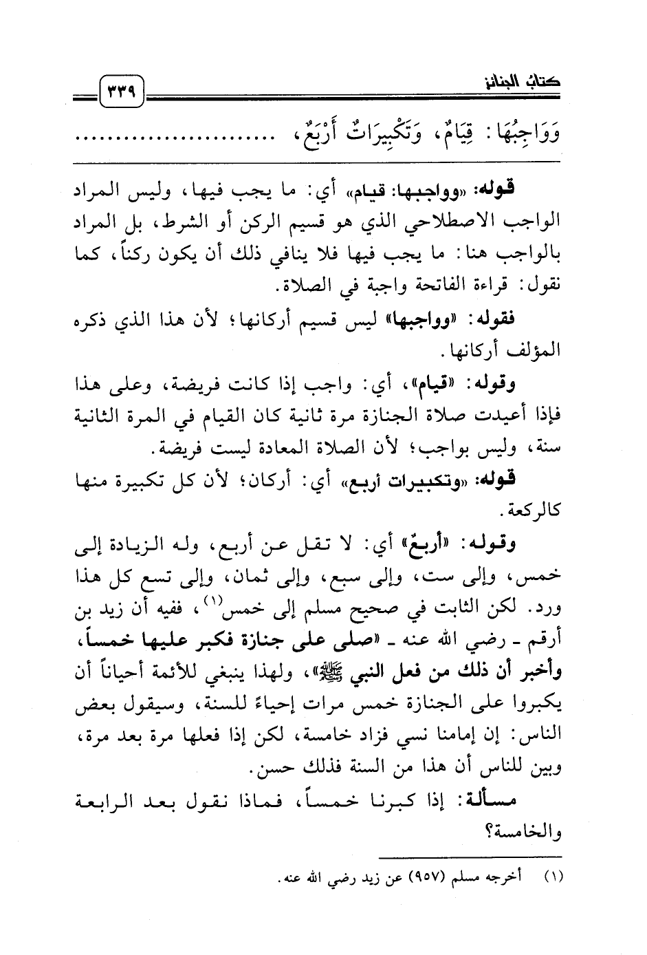 وقوله: «أربعٌ» أي: لا تقل عن أربع، وله الزيادة إلى خمس، وإلى ست، وإلى سبع، وإلى ثمان، وإلى تسع كل هذا ورد. لكن الثابت في صحيح مسلم إلى خمس (¬1)، ففيه أن زيد بن أرقم ـ رضي الله عنه ـ «صلى على جنازة فكبر عليها خمساً، وأخبر أن ذلك من فعل النبي صلّى الله عليه وسلّم»، ولهذا ينبغي للأئمة أحياناً أن يكبروا على الجنازة خمس مرات إحياءً للسنة، وسيقول بعض الناس: إن إمامنا نسي فزاد خامسة، لكن إذا فعلها مرة بعد مرة، وبين للناس أن هذا من السنة فذلك حسن.