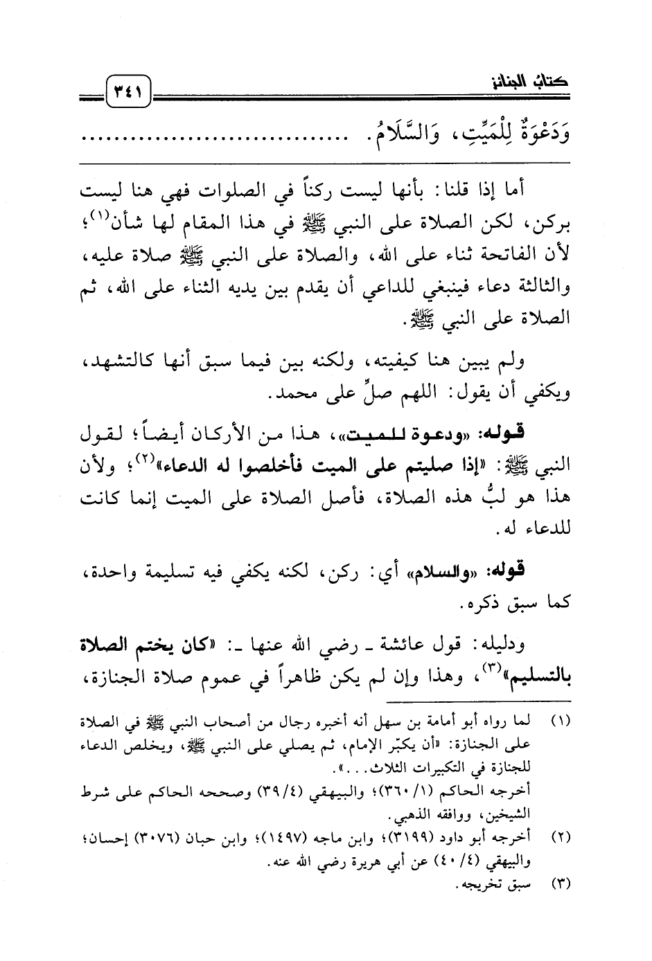 ودليله: قول عائشة ـ رضي الله عنها ـ: «كان يختم الصلاة بالتسليم» (¬3)، وهذا وإن لم يكن ظاهراً في عموم صلاة الجنازة،