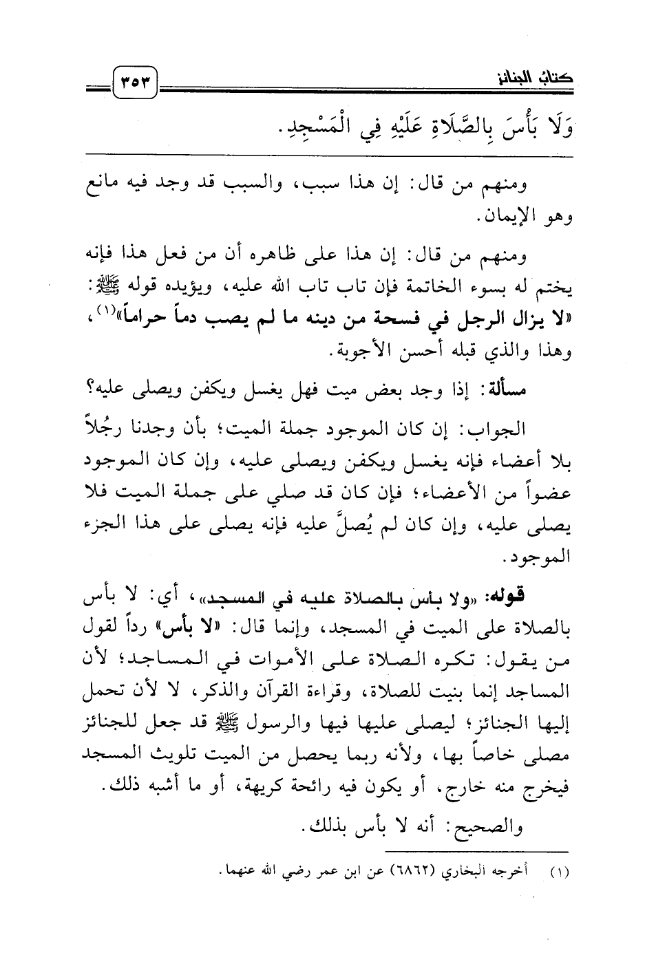قوله: «ولا بأس بالصلاة عليه في المسجد»، أي: لا بأس بالصلاة على الميت في المسجد، وإنما قال: «لا بأس» رداً لقول من يقول: تكره الصلاة على الأموات في المساجد؛ لأن المساجد إنما بنيت للصلاة، وقراءة القرآن والذكر، لا لأن تحمل إليها الجنائز؛ ليصلى عليها فيها والرسول صلّى الله عليه وسلّم قد جعل للجنائز مصلى خاصاً بها، ولأنه ربما يحصل من الميت تلويث المسجد فيخرج منه خارج، أو يكون فيه رائحة كريهة، أو ما أشبه ذلك.