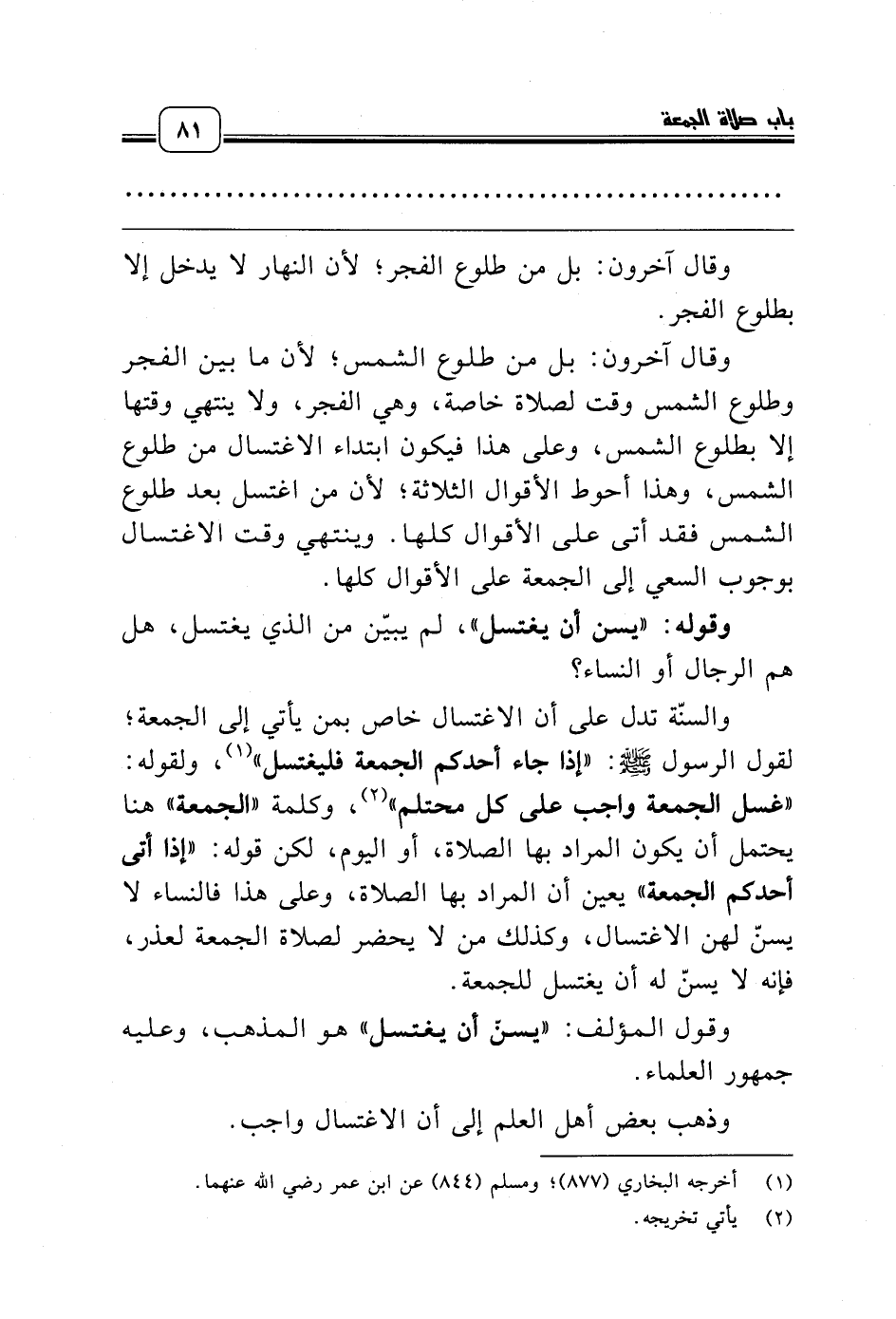 وقال آخرون: بل من طلوع الشمس؛ لأن ما بين الفجر وطلوع الشمس وقت لصلاة خاصة، وهي الفجر، ولا ينتهي وقتها إلا بطلوع الشمس، وعلى هذا فيكون ابتداء الاغتسال من طلوع الشمس، وهذا أحوط الأقوال الثلاثة؛ لأن من اغتسل بعد طلوع الشمس فقد أتى على الأقوال كلها. وينتهي وقت الاغتسال بوجوب السعي إلى الجمعة على الأقوال كلها.