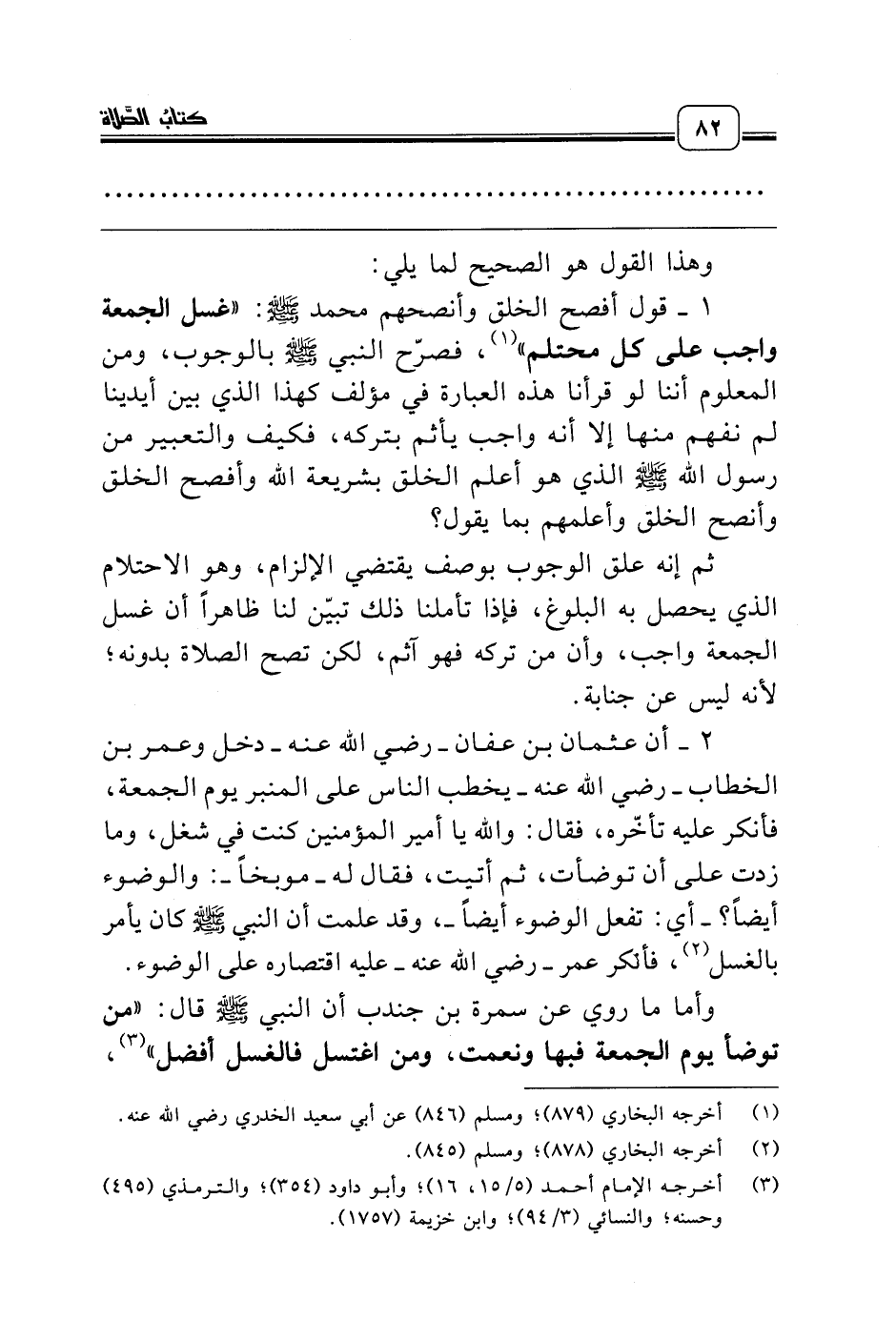 1 ـ قول أفصح الخلق وأنصحهم محمد صلّى الله عليه وسلّم: «غسل الجمعة واجب على كل محتلم» (¬1)، فصرّح النبي صلّى الله عليه وسلّم بالوجوب، ومن المعلوم أننا لو قرأنا هذه العبارة في مؤلف كهذا الذي بين أيدينا لم نفهم منها إلا أنه واجب يأثم بتركه، فكيف والتعبير من رسول الله صلّى الله عليه وسلّم الذي هو أعلم الخلق بشريعة الله وأفصح الخلق وأنصح الخلق وأعلمهم بما يقول؟