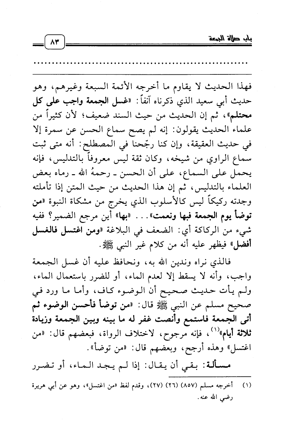 فالذي نراه وندين الله به، ونحافظ عليه أن غسل الجمعة واجب، وأنه لا يسقط إلا لعدم الماء، أو للضرر باستعمال الماء، ولم يأت حديث صحيح أن الوضوء كاف، وأما ما ورد في صحيح مسلم عن النبي صلّى الله عليه وسلّم قال: «من توضأ فأحسن الوضوء ثم أتى الجمعة فاستمع وأنصت غفر له ما بينه وبين الجمعة وزيادة ثلاثة أيام» (¬1)، فإنه مرجوح، لاختلاف الرواة، فبعضهم قال: «من اغتسل» وهذه أرجح، وبعضهم قال: «من توضأ».