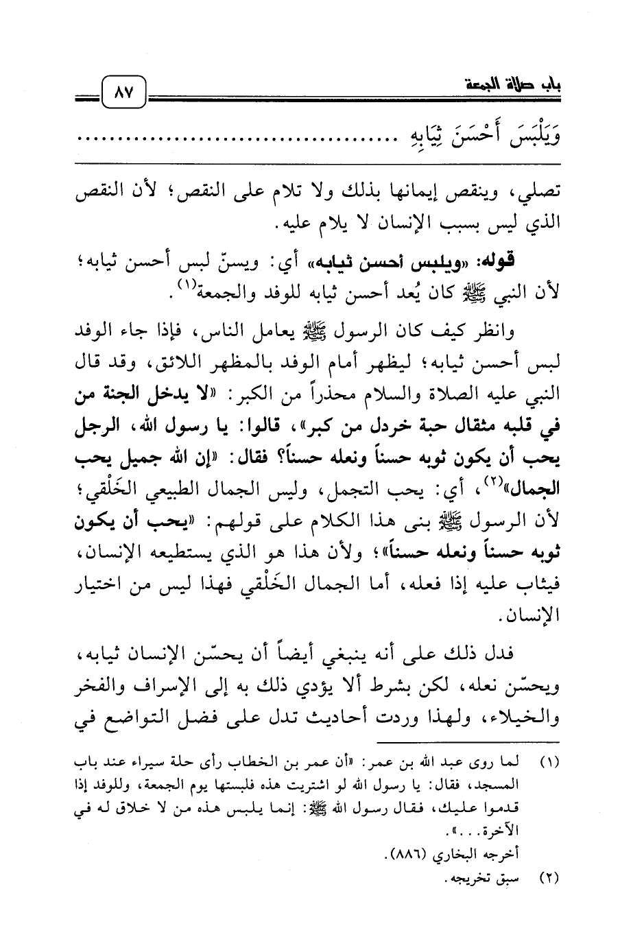 فدل ذلك على أنه ينبغي أيضاً أن يحسّن الإنسان ثيابه، ويحسّن نعله، لكن بشرط ألا يؤدي ذلك به إلى الإسراف والفخر والخيلاء، ولهذا وردت أحاديث تدل على فضل التواضع في