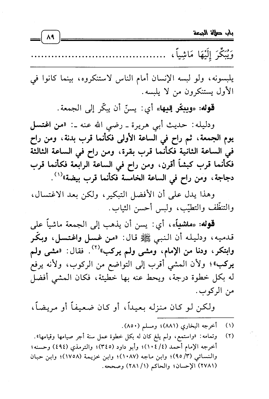قوله: «ماشياً»، أي: يسن أن يذهب إلى الجمعة ماشياً على قدميه، ودليله أن النبي صلّى الله عليه وسلّم قال: «من غسل واغتسل، وبكّر وابتكر، ودنا من الإمام، ومشى ولم يركب» (¬2). فقال: «مشى ولم يركب»؛ ولأن المشي أقرب إلى التواضع من الركوب، ولأنه يرفع له بكل خطوة درجة، ويحط عنه بها خطيئة، فكان المشي أفضل من الركوب.
