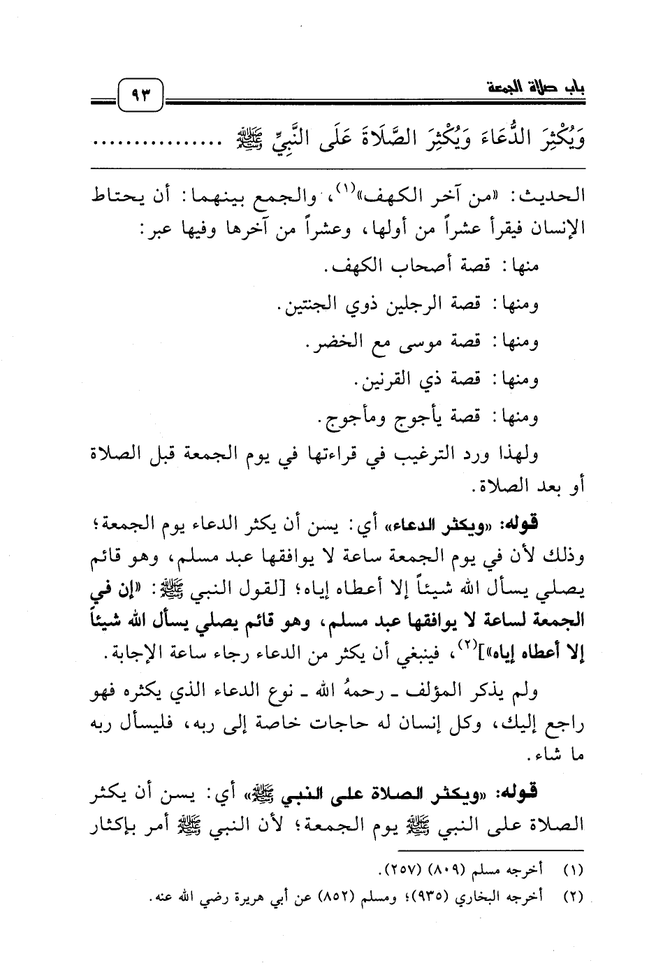 قوله: «ويكثر الدعاء» أي: يسن أن يكثر الدعاء يوم الجمعة؛ وذلك لأن في يوم الجمعة ساعة لا يوافقها عبد مسلم، وهو قائم يصلي يسأل الله شيئاً إلا أعطاه إياه؛ [لقول النبي صلّى الله عليه وسلّم: «إن في الجمعة لساعة لا يوافقها عبد مسلم، وهو قائم يصلي يسأل الله شيئاً إلا أعطاه إياه»] (¬2)، فينبغي أن يكثر من الدعاء رجاء ساعة الإجابة.