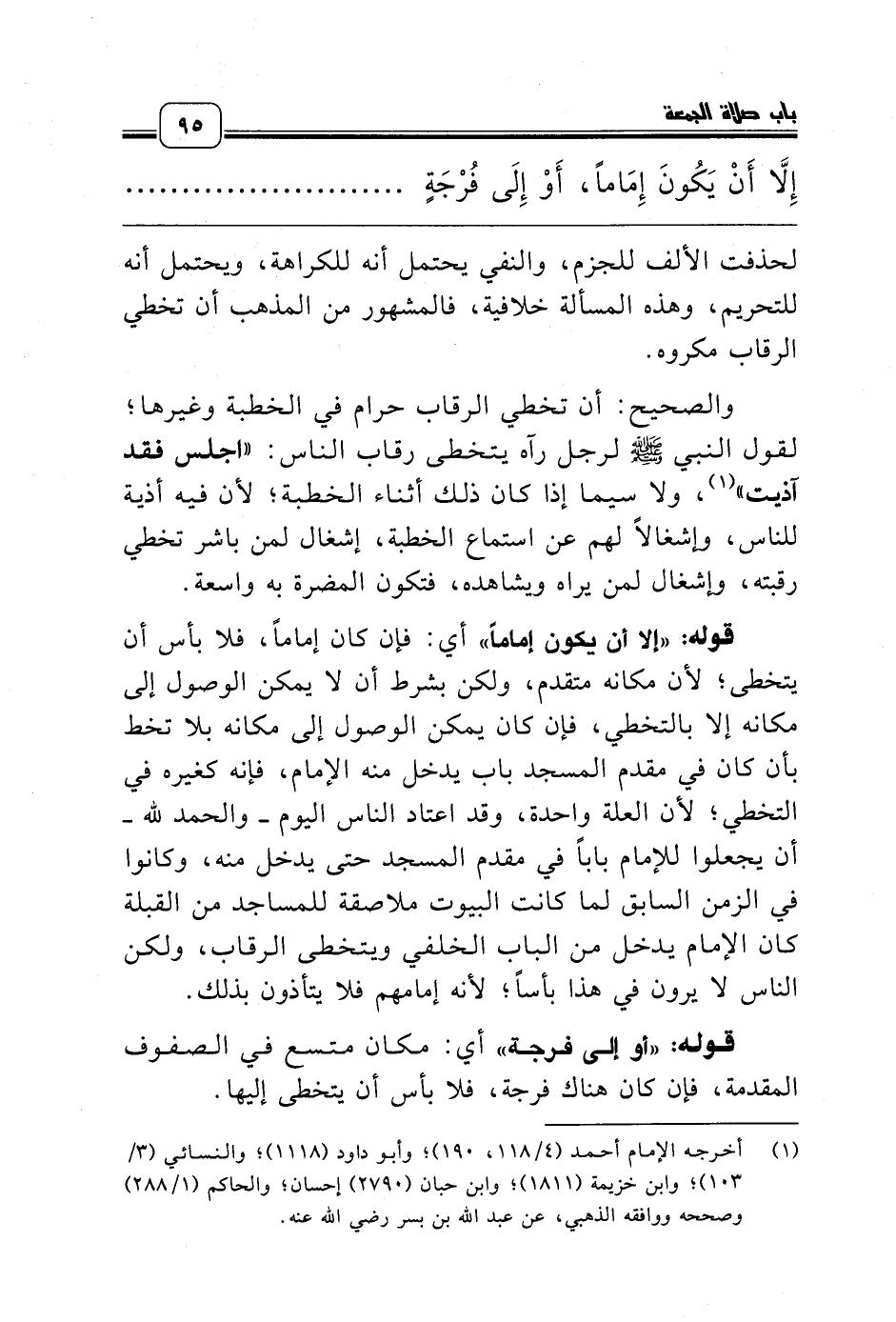 قوله: «إلا أن يكون إماماً» أي: فإن كان إماماً، فلا بأس أن يتخطى؛ لأن مكانه متقدم، ولكن بشرط أن لا يمكن الوصول إلى مكانه إلا بالتخطي، فإن كان يمكن الوصول إلى مكانه بلا تخط بأن كان في مقدم المسجد باب يدخل منه الإمام، فإنه كغيره في التخطي؛ لأن العلة واحدة، وقد اعتاد الناس اليوم ـ والحمد لله ـ أن يجعلوا للإمام باباً في مقدم المسجد حتى يدخل منه، وكانوا في الزمن السابق لما كانت البيوت ملاصقة للمساجد من القبلة كان الإمام يدخل من الباب الخلفي ويتخطى الرقاب، ولكن الناس لا يرون في هذا بأساً؛ لأنه إمامهم فلا يتأذون بذلك.