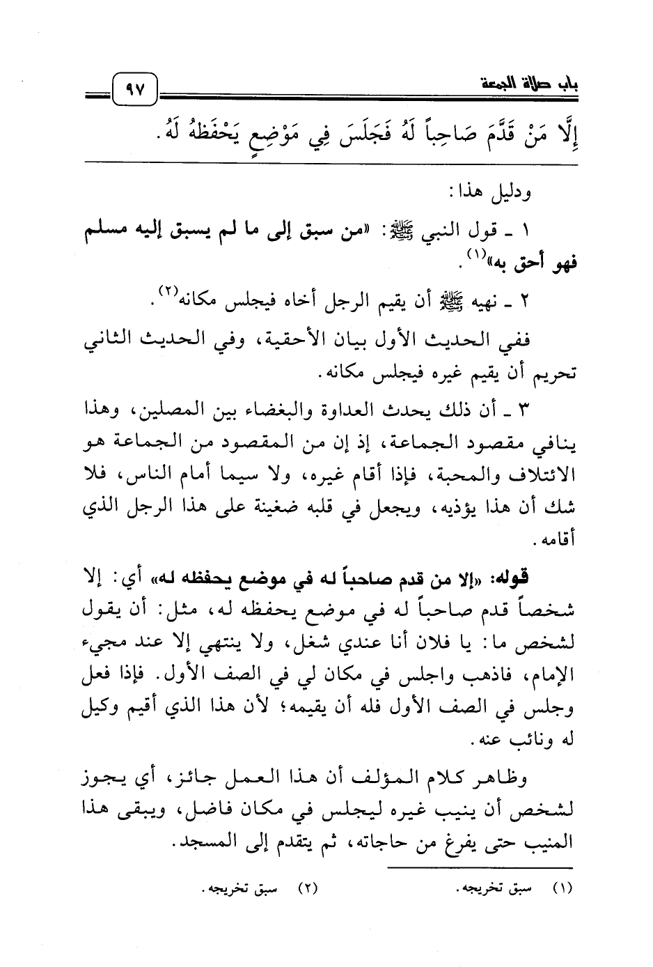 إِلاَّ مَنْ قَدَّمَ صَاحِباً لَهُ فَجَلَسَ فِي مَوْضِعٍ يَحْفَظهُ لَهُ.