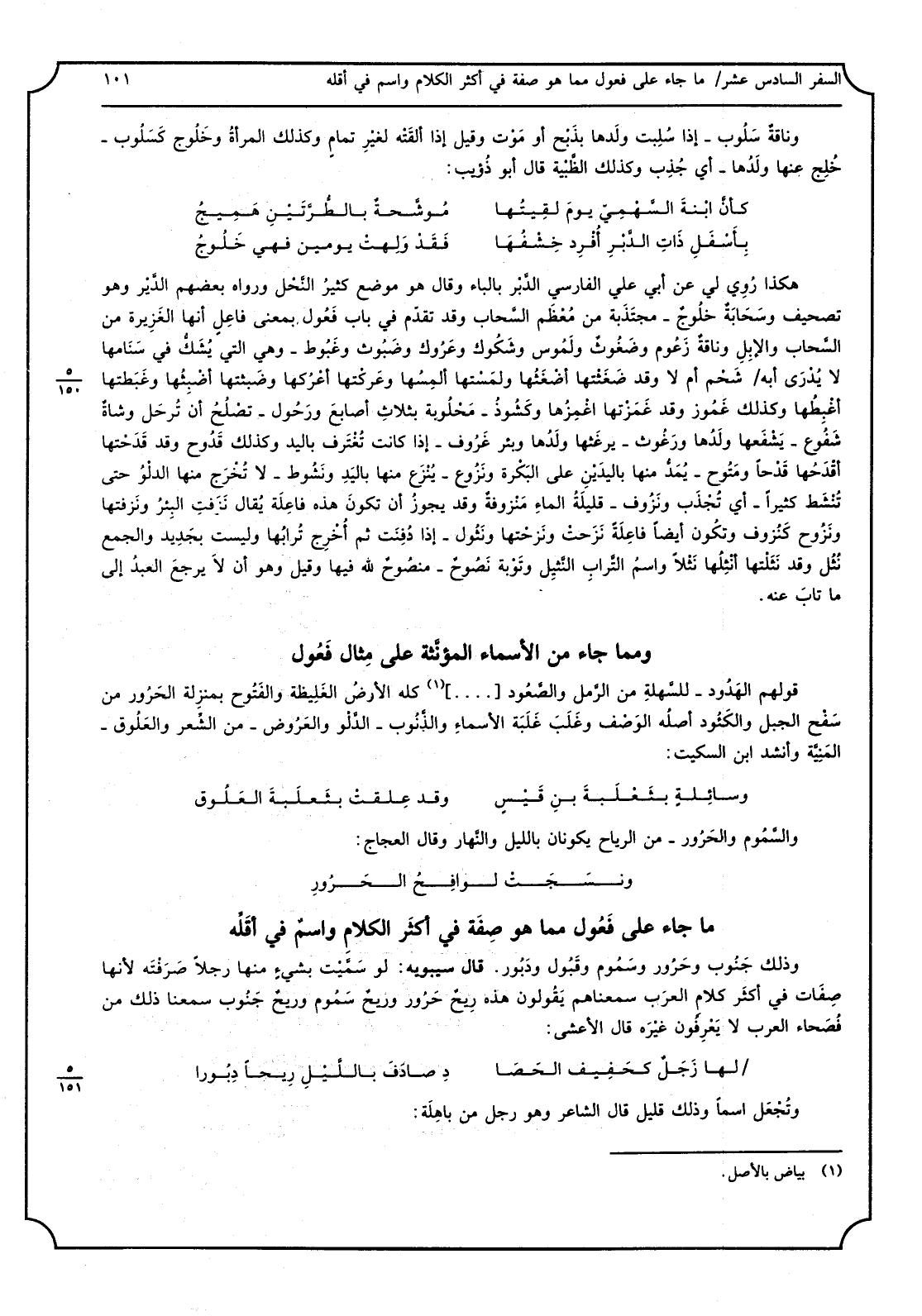 قَوْلهم الهَدُود - للسَّهلةِ من الرَّمل والصَّعُود [ ... ] كُله الأرضُ الغَلِيظة والفَتُوح بمنزِلة الحَرُور من سَفْح الْجَبَل والكَثُود أصلُه الوَصْف وغَلَبَ غَلَبَة الأسماءِ والذَّنُوب - الدَّلْو والعَرُوض - من الشِّعر والعَلُوق - المَنِيَّة وَأنْشد ابْن السّكيت: