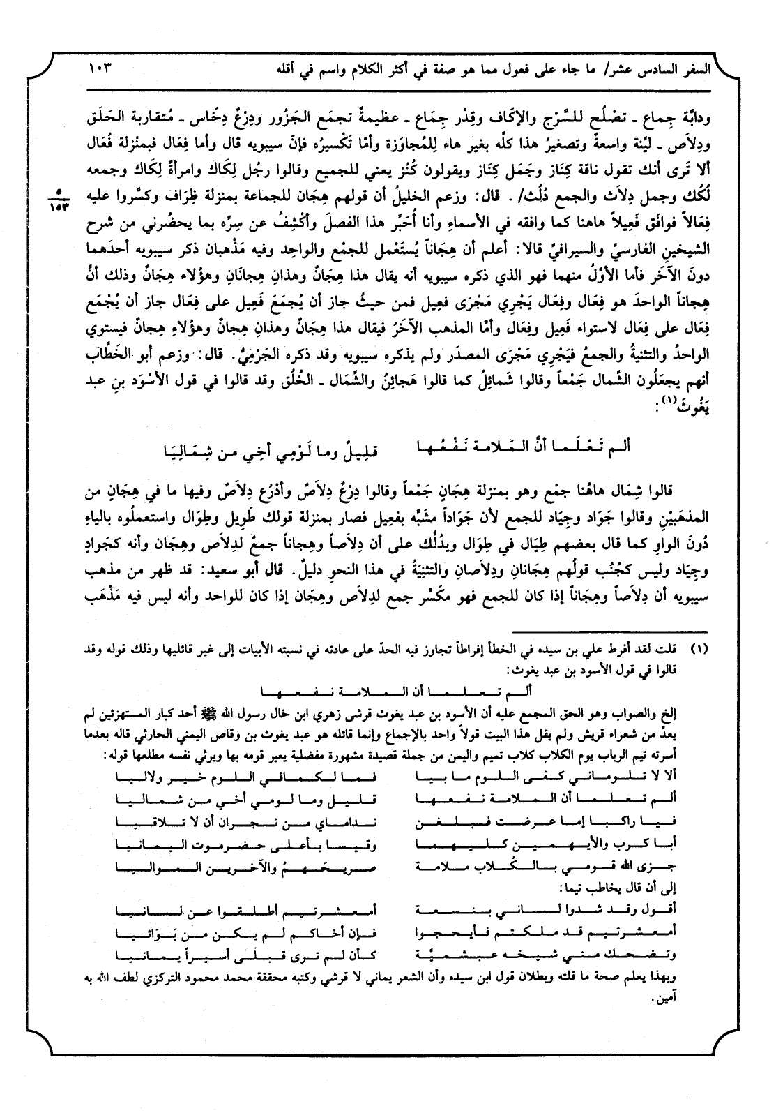 ودابَّة جِماع - تصْلُح للسَّرْج والإكَاف وقِدْر جِمَاع - عظيمةٌ تجمَع الجَزُور ودِرْعٌ دِخَاس - مُتقاربة الحَلَق ودِلاَص - ليِّنة واسعةٌ وتصغيرُ هَذَا كلِّه بِغَيْر هَاء لِلمُجاوَزة وأمّا تَكْسيرُه فإنّ سِيبَوَيْهٍ قَالَ فِعَال فبمنْزلة فُعَال أَلا تَرى أَنَّك تَقول نَاقَة كِنَاز وجَمَل كَنَاز وَيَقُولُونَ كُنُز يَعْنِي للْجَمِيع وَقَالُوا رجُل لِكَاك وامرأةٌ لِكَاك وَجمعه لُكُك وجمل دِلاَث وَالْجمع دُلُث قَالَ: وَزعم الخليلُ أَن قَوْلهم هِجَان للْجَمَاعَة بِمَنْزِلَة ظِرَاف وكسَّروا عَلَيْهِ فِعَالاً فوافَق فَعِيلاً هَاهُنَا كَمَا وَافقه فِي الأسماءِ وَأَنا أُحَبِّر هَذَا الفصلَ وأكْشِفُ عَن سَرِّه بِمَا يحضُرني من شرح الشَّيْخَيْنِ الفارسيِّ والسيرافيِّ قَالَا: أعلم أَن هِجَاناً يُستَعْمل للجمْع والواحِد وَفِيه مَذْهبان ذكر سِيبَوَيْهٍ أحدَهما دونَ الآخَر فَأَما الأوَّلُ مِنْهُمَا فَهُوَ الَّذِي ذكره سِيبَوَيْهٍ أَنه يُقَال هَذَا هِجَانٌ وهذانِ هِجانَانِ وهؤُلاء هِجَانٌ وَذَلِكَ أنَّ هِجاناً الواحدَ هُوَ فِعَال وفِعَال يَجْرِي مَجْرَى فعِيل فَمن حيثُ جَازَ أَن يُجمَعَ فَعِيل على فِعَال جَازَ أَن يُجْمَع فِعَال على فِعَال لِاسْتِوَاء فَعِيل وفِعَال وأماَّ الْمَذْهَب الآخَرُ فَيُقَال هَذَا هِجَانٌ وهذانِ هِجانٌ وهؤُلاءِ هِجانٌ فيستوي الواحدُ والتثنيةُ والجمعُ فيَجْرِي مَجْرَى المصدَر وَلم يذكرهُ سيبوه وَقد ذكره الجَرْمِيُّ قَالَ: وَزعم أَبُو الخَطَّاب أَنهم يجعَلُون الشِّمال جَمْعاً وَقَالُوا شَمائِلُ كَمَا قَالُوا هَجائِنُ والشِّمَال - الخُلُق وَقد قَالُوا فِي قَول الأسْوَد بنِ عبد يَغُوثَ: