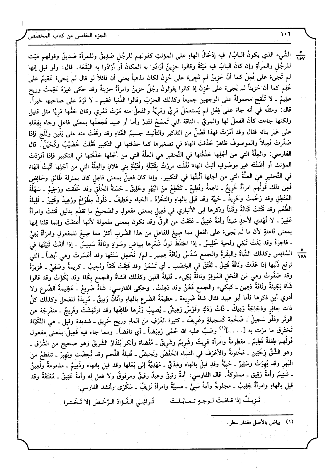 الشَّيء الَّذِي يكونُ البابُ فِيهِ إدْخَالُ الهاءِ على المؤنثِ كَقَوْلِهِم للرجُلِ صَدِيقٌ وللمرأة صَديقٌ وَقَوْلهمْ مَيْت للرجُلِ والمرأةِ وَإِن كانَ البابُ فِيهِ مَيْتَةَ وَقَالُوا حزِينٌ أرَادُوا بِهِ المكانَ أَو أرَادُوا بِهِ البُقْعَة قَالَ: لَو قيل إِنَّهَا لم تَجيءْ على فُعِلَ كَمَا أنّ حَزِينٌ لم تَجِيءُ على حُزِنَ إِذْ كَانُوا يقولونَ رجُلٌ حزينٌ وامرأةٌ حزينةٌ وَقد حكى غيرُهُ عَقِمتْ وريح عقِيمٌ - لَا تُلْقح محمولةٌ على الْوَجْهَيْنِ جَمِيعًا وَكَذَلِكَ الحرْبُ وَقَالُوا الدُّنيا عَقيم - لَا تَرُدّ على صَاحبهَا خيرا قَالَ: ومثلُه فِي أَنه جاءَ على فِعْل لم يُستعمَلْ مَرِيٌّ ومَرِيَّةٌ والفعلُ مِنْهُ مَرَتْ تَمْرِي وَكَانَ حَقُّها مَرِيًّا مثل قَتِيل وَلكنهَا جَاءَت كأنّ الفعلَ لَهَا والمريُّ - النَّاقة الَّتِي تُمسَحُ لتَدِرَّ وَأما أَبُو عبيد فَجَعلَها بمعنَى فاعلٍ وَجَاء بِفِعْلهِ على غير بنائِهِ فَقَالَ وَقد أمْرَتْ فَهَذَا فَصْلٌ من التَّذْكِير والتأنيث جسيمُ الغَنَاءِ وَقد وقَفْتَ مِنْهُ على يَقين وثَلَجٍ فَإِذا صَغَّرتَ فَعِيلاً والموصوفُ ظاهرٌ حَذَفتَ الهاءَ فِي تصغيرها كَمَا حذفتها فِي التَّكْبِير فَقُلتَ خُضَيِّبٌ وكُحَيِّلٌ قَالَ الْفَارِسِي: والعِلَّةُ الَّتِي من أجْلِها حَذَفْتها فِي التَّحقير هِيَ العلَّةُ الَّتِي من أجْلها حَذَفْتها فِي التَّكْبِير فَإِذا أفرَدْتَ الْمُؤَنَّث أَو أضَفْتَه غير موصُوفٍ أثبتَّ الهاءَ فَقُلْت مررْتُ بِقُتَيِّلَةٍ وقُتَيِّلَةِ بني فلانٍ والعِلَّةُ الَّتِي من أجْلِها أثْبتَّ الهَاءَ فِي التَّحقيرِ هِيَ العلَّةُ الَّتِي من أجلهَا أثْبتَّها فِي التَّكْبِير وَإِذا كَانَ فعيلٌ بِمَعْنى فاعِلٍ كَانَ بِمَنْزِلَة طَالقٍ وحَائِضٍ فَمِن ذَلِك قَولُهم امرأةٌ خَرِيعٌ - ناعِمةٌ وقَطِيعٌ - تَنْقَطِعُ منْ البُهْرِ وخَلِيقٌ - حَسَنةُ الخُلُقِ وَقد خَلُقت ورَخِيمٌ - سَهْلَةُ المَنْطِقِ وَقد رَخْمتْ وخَرِيدٌ - حَيِيَّة وَقد قيل بالهاءِ والتخَرُّدُ - الحَياء وعَطِيفٌ - ذَلُولٌ مِطْوَاعٌ وزَهِيدٌ وقَتِينٌ - قَلِيلةُ الطَّعءم وَقد قَتُنَتْ قَتَانَةً وقَتَناً وَذكرهَا ابْن الْأَنْبَارِي فِي فَعِيل بِمَعْنى مفعولٍ والصَحيحُ مَا تقدّم بِدَلِيل قَتنَتْ وامراةٌ عَفِيرٌ - لَا تُهْدي لأحدٍ شَيْئا وأمضةٌ عَتِيقٌ - عَتَقَتْ من الرقِّ وَقد تكون بِمَعْنى مفعولة لِأَنَّهَا أُعتقَتْ وَإِنَّمَا قُلْنَا إِنَّهَا بِمَعْنى فَاعلةٍ لِأَن مَا لَم يَجيءْ على الفعلِ مِمَّا صِيغَ للفاعلِ من هَذَا الضَّربِ أكثرُ مِمَّا صِيغَ للمفعولِ وامرَأةٌ بَغِيٌّ - فاجرةٌ وَقد بَغَتْ تَبْغِي ولحية خَلِيسٌ - إِذا اختلَطَ لونُ شَعَرِها ببياضٍ وسَوادٍ ونَاقَةٌ سَدِيسٌ - إِذا ألقَتْ ثَنِيَّتَها فِي السَّادِس وَكَذَلِكَ الشَّاةُ والبقَرةُ وَالْجمع سُدُسٌ ونَاقَةٌ عِسِير - لم تَحْمِل سَنَتَها وَقد أعْسَرَتْ وَهِي أَيْضا - الَّتِي ترفع ذَنَبها إِذا عَدَتْ ونَاقَةٌ فَتِيقٌ - تَفْتَقُ فِي الخِصْب - أَي تَسْمَنُ وَقد فَتِقَتْ فَتَقاً ونَجِيبٌ - كريمةٌ وصَفِيٌّ - غَزيرَةٌ وَقد صَفُوتْ وَهِي من النَّخلِ المُوقِرُ وناقَةٌ بَكِيء - قَليلةُ اللَّبن وَكَذَلِكَ الشاةُ وَالْجمع بِكَاءٌ وَقد بَكُؤَتْ وَقد قَالُوا شَاة بَكِيئَةٌ ونَاقَةٌ دَهِين - كبكيء وَالْجمع دُهُنٌ وَقد دَهِنَتْ وَحكى الْفَارِسِي: شَاةٌ ضَرِيعٌ - عَظِيمةُ الضَّرع وَلَا أَدْرِي أَيْن ذكرهَا فَأَما أَبُو عبيد فَقَالَ شاةٌ ضَرِيعة - عظيمَةُ الضَّرع بالهاءِ وأتَانٌ وَدِيقٌ - مُرِيدَةٌ للفحل وَكَذَلِكَ كلُّ ذَات حافِرٍ ودَجَاجَةٌ وَدِيكٌ - ذَاتُ وَدَكٍ وقَوْسٌ رَهِيشٌ - يُصِيبُ وَتُرها طَائِفَها وَقد ارتَهَشَتْ وفَرِيجٌ - منفَرِجَة عَن الوتَر ودَلْو سَجيلٌ - ضَخْمة كَسجيلةٍ وغَرِيفٌ - كَثِيرَة الغَرْفِ من الماءِ وريح خَرِيق - شَدِيدَة وَقيل - هِيَ الن