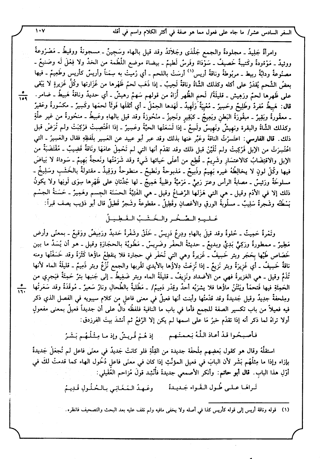 وتَمْرةٌ حَمِيتٌ - حُلوةٌ وَقد قيلَ بالهاءِ ودِرعٌ دَرِيسٌ - خَلَقٌ وشَفْرةٌ حَديدٌ ورَمِيضٌ ووَقيعٌ - بِمَعْنى وَأَرْض مَطِيرٌ - ممطورةٌ ورَكيٌّ بَدِيٌّ وبديعٌ - حديثهُ الحفْر وضَرِيسٌ - مَطْويَّة بالحجَارَةِ وَقيل - هُوَ أَن يُسَدَّ مَا بَين خَصَاص طَيِّها بِحَجَر وبئر خَسِيفٌ - غَزيرةٌ وَهِي الَّتِي تُحَفَر فِي حِجَارَة فَلَا ينقطِعُ ماؤُها كَثْرَةً وَقد خَسَفْتُها وَمِنْه ناقةٌ خَسِيفٌ - أَي غَزِيرَةٌ وبئر نَزيعٌ - إِذا نُزِعَتْ دِلاؤُها بِالْأَيْدِي لقُربها وَالْجمع نُزُعٌ وبئر ذَمِيمٌ - قليلَةُ المَاء لِأَنَّهَا تُذَمُّ وَقيل - هِيَ الغزيرةُ فَهِيَ من الأضداد ونَزِيفٌ - قليلَةُ المَاء وبئر ضَغِيطٌ - إِلَى جَنبها بئرٌ حَمِئَةٌ فيَجرِ] من الحَمِئَةِ فِيهَا فَتحمَأ ويَنْتُنُ ماؤُها فَلَا يشرَبُه أحدٌ وقِدْر دَمِيمٌ - مَطْليةٌ بالطِّحالِ ونارٌ سَعيرٌ - مُوقَدَةٌ وَقد سَعَرتُها ومِلحفةٌ جدِيدٌ وَقيل جَديدةٌ وَقد قدّمتُها وأبنت أَنَّهَا فعيلٌ فِي معنى فاعلٍ من كَلَام سِيبَوَيْهٍ فِي الْفَصْل الَّذِي ذكر فِيهِ فعيلاً من بَاب تكسير الصّفة للْجمع فَأَما فِي بَاب مَا النَّاقة فلفظُه دالٌّ على أَن جَدِيدا فعيلٌ بِمَعْنى مفعولٍ أَولا تراهُ لما ذكر أَنه إِذا تقدّم خبرُ مَا على اسْمهَا لم يكن إِلَّا الرَّفعُ ثمَّ أنشدَ بيتَ الفرزدق: