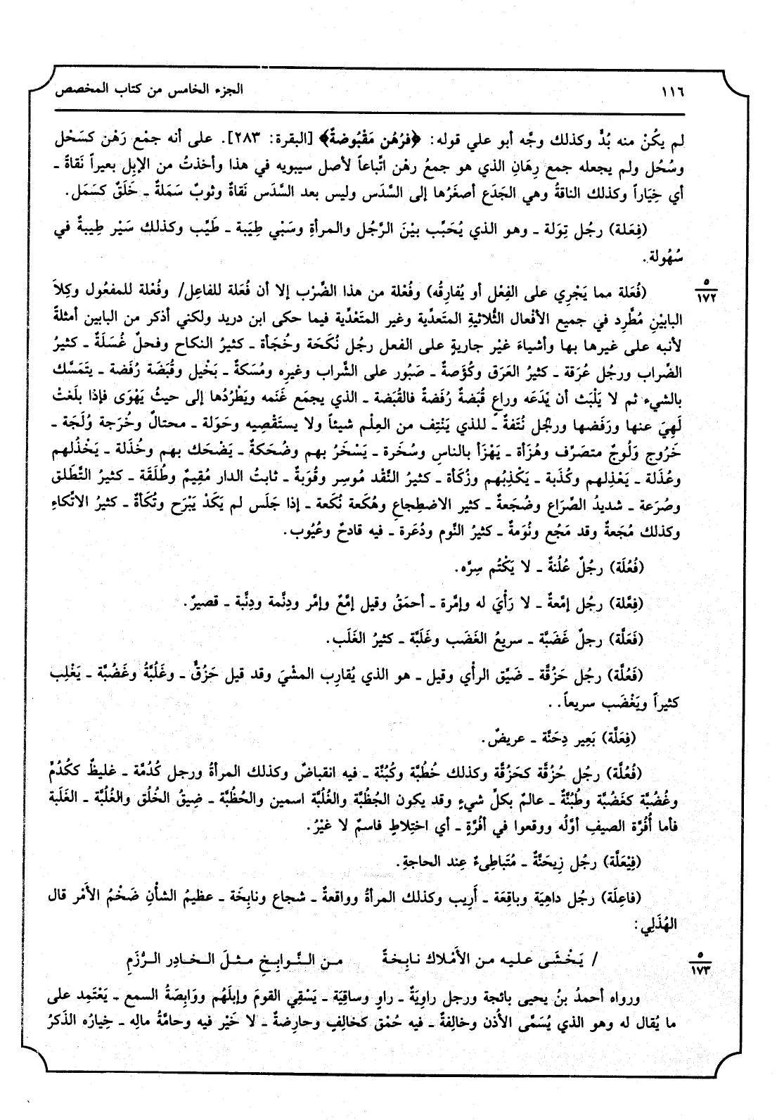 وَرَوَاهُ أحمدُ بنُ يحيى بائجة وَرجل راوِيَةٌ - راوٍ وساقِيَة - يَسْقِي القومَ وإبلَهُم ووَابِصَةُ السّمع - يَعْتَمشد على مَا يُقال لَهُ وَهُوَ الَّذِي يُسَمَّى الأُذن وخالِفةٌ - فِيهِ حُمْق كخالِفٍ وحارِضةٌ - لَا خَيْر فِيهِ وحامَّةُ مالِه - خِيارُه الذَكرُ