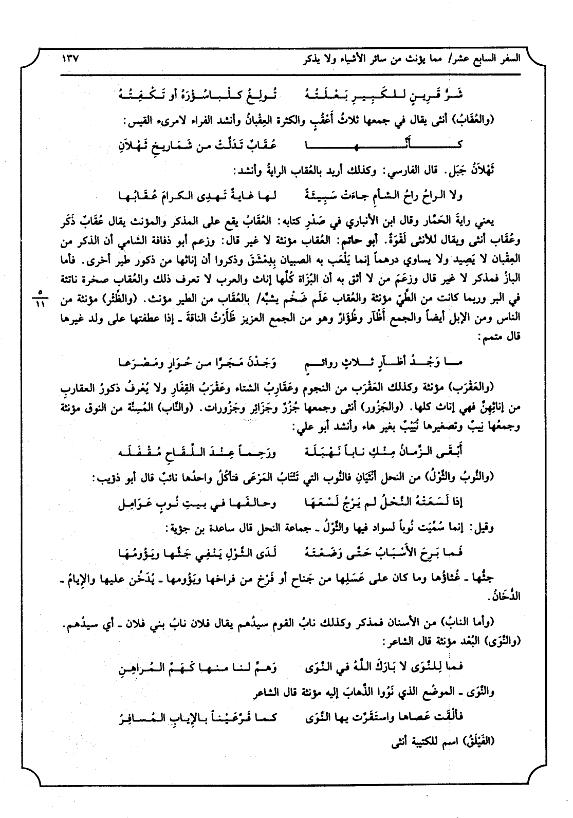 (والعَقْرَب) مُؤَنّثَة وَكَذَلِكَ العَقْرَب من النُّجُوم وعَقَارِبُ الشتَاء وعَقْرَبُ القِفَارِ وَلَا يُعْرفُ ذكورُ العقارِب من إناثِهِنَّ فَهِيَ إناث كلهَا (والجَزُور) أُنْثَى وَجَمعهَا جُزُرٌ وجَزَائِر وجَزُورات (والنَّاب) المُسِنَّة من النوق مُؤَنّثَة وجمعُها نِيبٌ وتصغيرها نُيَيْتٌ بِغَيْر هَاء وَأنْشد أَبُو عَليّ: