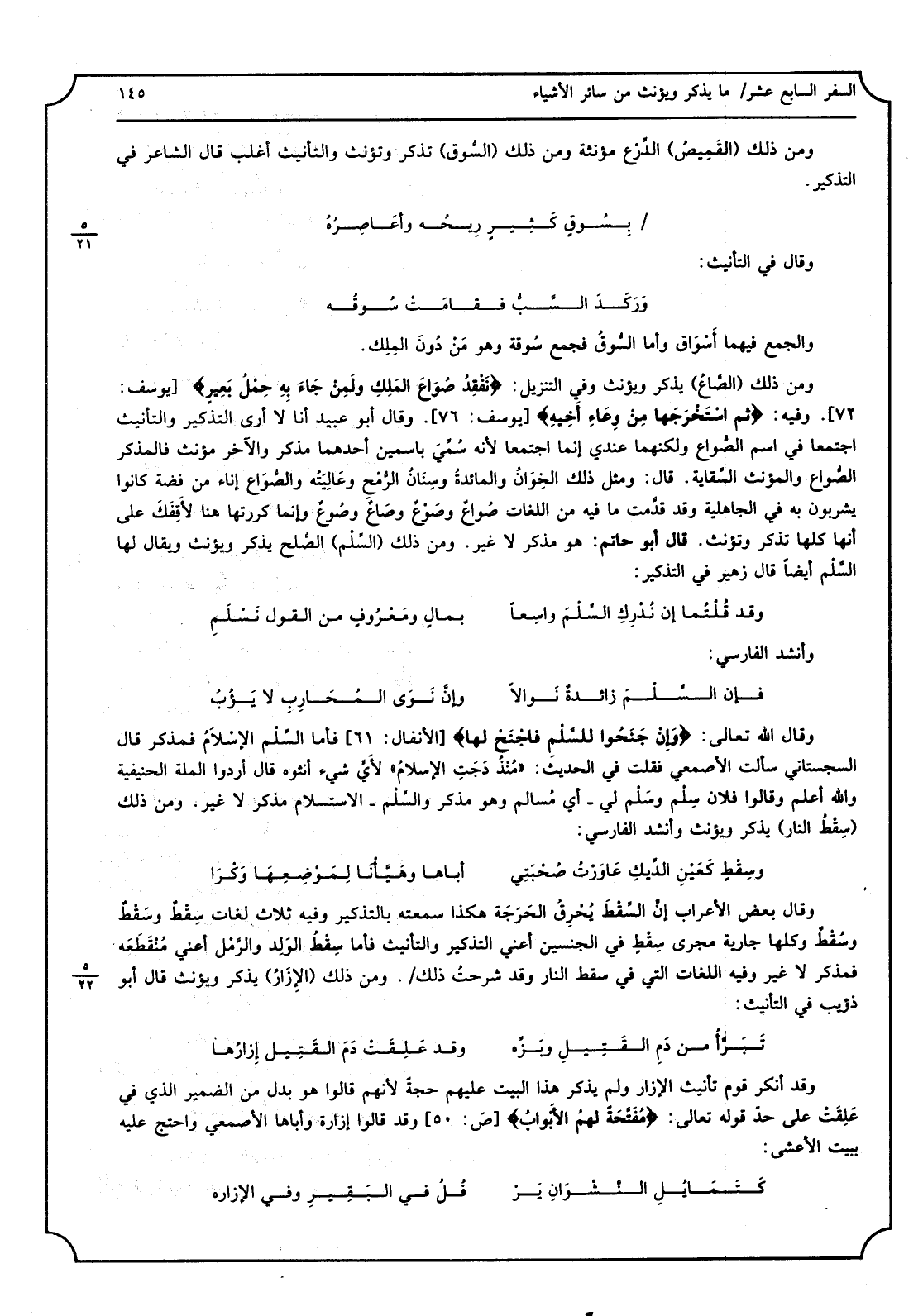 وَمن ذَلِك (الصَّاعُ) يذكر وَيُؤَنث وَفِي التَّنْزِيل: {نَفْقِدُ صُوَاعَ المَلِك ولَمِنْ جَاءَ بِهِ حِمْلُ بَعِيرٍ} [يُوسُف: 72] وَفِيه: {ثمَّ اسْتَخْرَجَها مِنْ وِعَاءِ أَخِيهِ} [يُوسُف: 76] وَقَالَ أَبُو عبيد أَنا لَا أرى التَّذْكِير والتأنيث اجْتمعَا فِي اسْم الصُّواع وَلكنهَا عِنْدِي إِنَّمَا اجْتمعَا لِأَنَّهُ سُمِّيَ باسمين أَحدهمَا مُذَكّر وَالْآخر مؤنث فالمذكر الصُّواع والمؤنث السِّقاية قَالَ: وَمثل ذَلِك الخَواَنُ والمائدةُ وسِنَانُ الرُّمْحِ وعَالِيَتُه والصُّوَاع إِنَاء من فضَّة كَانُوا يشربون بِهِ فِي الْجَاهِلِيَّة وَقد قدَّمت مَا فِيهِ من اللُّغَات صُواعٌ وصَوْعٌ وصَاعٌ وصُوعٌ وَإِنَّمَا كررتها هُنَا لأَقِفَكَ على أَنَّهَا كلهَا تذكر وتؤنث قَالَ أَبُو حَاتِم: هُوَ مُذَكّر لَا غير وَمن ذَلِك (السِّلْم) الصُّلح يذكر وَيُؤَنث وَيُقَال لَهَا السَّلْم أَيْضا قَالَ زُهَيْر فِي التَّذْكِير: