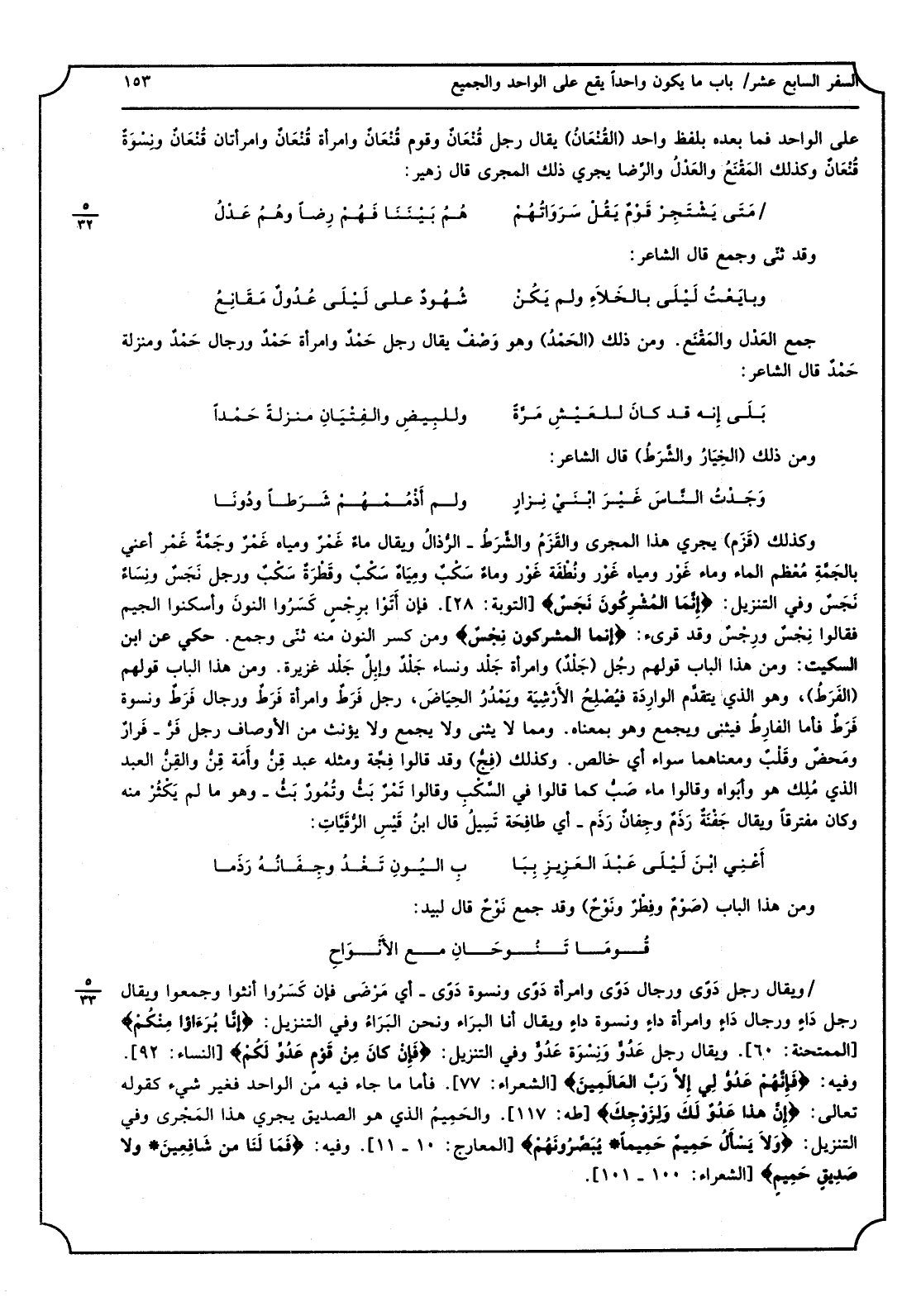 وَيُقَال رجل ذوًى وَرِجَال دَوًى وَامْرَأَة دوًى ونسوة دَوًى - أَي مَرْضَى فَإِن كَسَرُوا أنثوا وجمعوا وَيُقَال رجل دَاءٍ وَرِجَال دَاءٍ وَامْرَأَة داءٍ ونسوة داءٍ وَيُقَال أَنا البرَاء وَنحن البَرَاءُ وَفِي التَّنْزِيل: {إنَّا بُرَءَاؤا مِنْكُمْ} [الممتحنة: 60] وَيُقَال رجل عَدُوُّ ونِسْوَة عَدُوٌّ وَفِي التَّنْزِيل: {فَإِنْ كانَ مِنْ قَوْمٍ عَدُوٍّ لَكُمْ} [النِّسَاء: 92] وَفِيه: {فَإِنَّهُمْ عَدُوٌ لِي إلاَّ رَبَّ العَالَمِينَ} [الشُّعَرَاء: 77] فَأَما مَا جَاءَ فِيهِ من الْوَاحِد فَغير شَيْء كَقَوْلِه تَعَالَى: {إِنَّ هَذَا عَدُوٌ لَكَ وَلِزَوْجِكَ} [طه: 117] والحَمِيمُ الَّذِي هُوَ الصّديق يجْرِي هَذَا المَجْرى وَفِي التنزيلك {وَلاَ يَسْأَلُ حَمِيمٌ حَمِيماً يُبَصَّرُونَهُمْ} [المعارج: 10 - 11] وَفِيه: {فَمَا لَنَا من شَافِعِينَ وَلَا صَدِيقٍ حَمِيمٍ} [الشُّعَرَاء: 100 - 101]