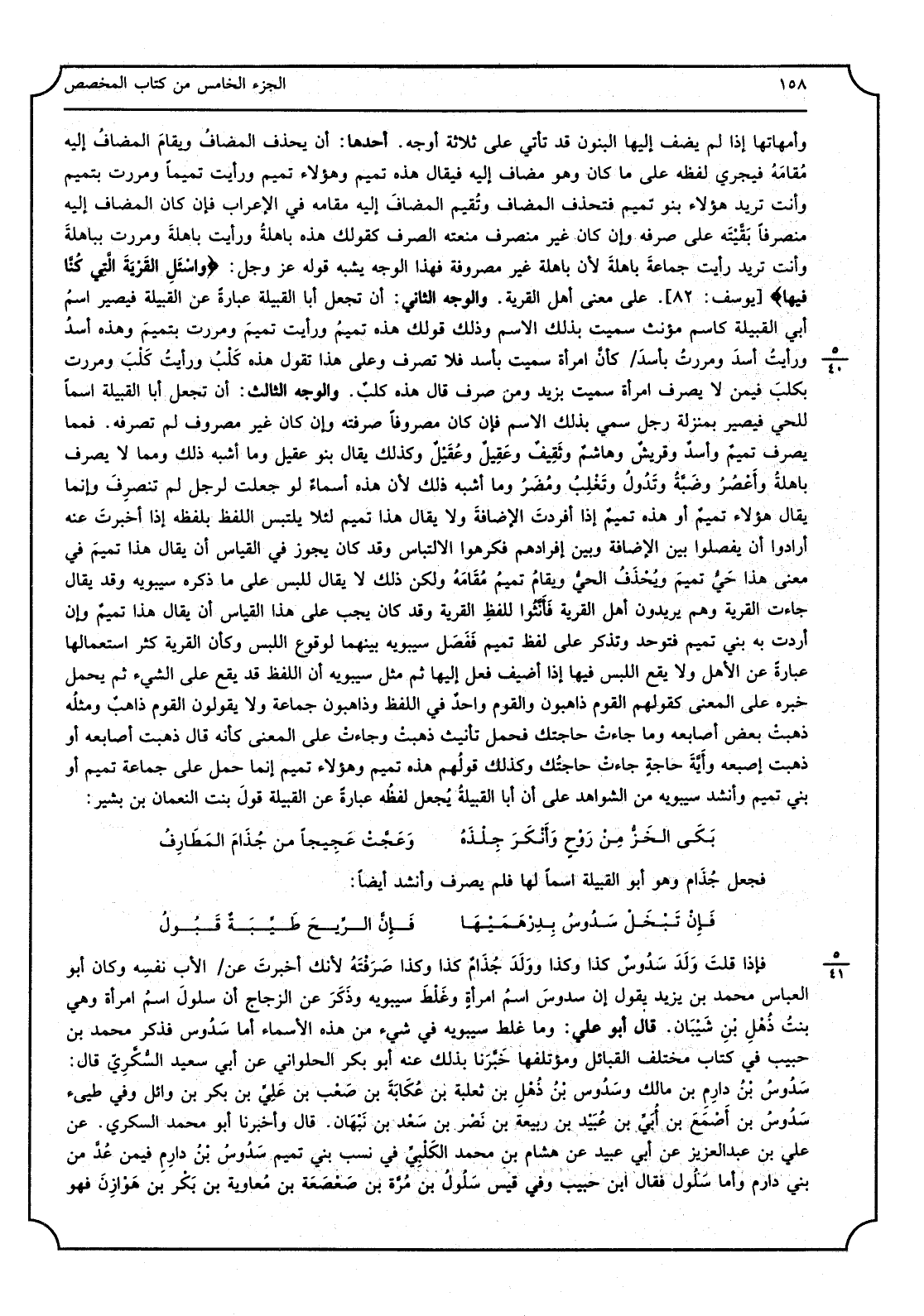 وأمهاتها إِذا لم يضف إِلَيْهَا البنون قد تَأتي على ثَلَاثَة أوجه أَحدهَا: أَن يحذف المضافُ ويقامَ المضافُ إِلَيْهِ مُقامَهُ فَيجْرِي لفظ على مَا كَانَ هُوَ مُضَاف إِلَيْهِ فَقَالَ هَذِه تَمِيم وَهَؤُلَاء تَمِيم وَرَأَيْت تميماً ومررت بتميم وَأَنت تُرِيدُ هَؤُلَاءِ بَنو تَمِيم فتحذف الْمُضَاف وتُقيم المضافَ إِلَيْهِ مقَامه فِي الْإِعْرَاب فَإِن كَانَ الْمُضَاف إِلَيْهِ منصرفاً بَقَّيْتَه على صرفه وَإِن كَانَ غير منصرف منعته الصّرْف كَقَوْلِك هَذِه باهلةُ وَرَأَيْت باهلةَ ومررت بباهلةَ وَأَنت تُرِيدُ رَأَيْت جماعةَ باهلةَ لِأَن باهلة غير مصروفة فَهَذَا الْوَجْه يشبه قَوْله عز وَجل: {واسْئَلِ القَرْيَةَ الَّتِي كُنَّا فِيهَا} [يُوسُف: 82] على معنى أهل الْقرْيَة وَالْوَجْه الثَّانِي: أَن تجْعَل أَبَا الْقَبِيلَة عبارَة عَن الْقَبِيلَة فَيصير اسمُ أبي الْقَبِيلَة كاسم مؤنث سميت بذلك الِاسْم وَذَلِكَ قَوْلك هَذِه تميمُ وَرَأَيْت تميمَ ومررت بتميمَ وَهَذِه أسدُ ورأيتُ أسدَ ومررتُ بأسدَ كأنَّ امْرَأَة سميت بأسد فَلَا تصرف وعَلى هَذَا تَقول هَذِه كَلْبُ ورأيتُ كَلْبَ ومررت بكلبَ فِيمَن لَا يصرف امْرَأَة سميت بزيد وَمن صرف قَالَ هَذِه كلبٌ وَالْوَجْه الثَّالِث: أَن تجْعَل أَبَا الْقَبِيلَة اسْما للحي فَيصير بِمَنْزِلَة رجل سمي بذلك الِاسْم فَإِن كَانَ مصروفاً صرفته وَإِن كَانَ غير مَصْرُوف لم تصرفه فمما يصرف تميمٌ وأسدٌ وقريشٌ وهاشمٌ وثَقِيفٌ وعَقِيلٌ وعُقَيْلٌ وَكَذَلِكَ يُقَال بَنو عقيل وَمَا أشبه ذَلِك وَمِمَّا لَا يصرف باهلةُ وأَعْصُرُ وضَبَّةُ وتَدُولُ وتَغْلِبُ ومُضَرُ وَمَا أشبه ذَلِك لِأَن هَذِه أسماءٌ لَو جعلت لرجل لم تنصرِفَ وَإِنَّمَا يُقَال هَؤُلَاءِ تميمٌ أَو هَذِه تميمٌ إِذا أفدرتَ الإضافةَ وَلَا يُقَال هَذَا تَمِيم لِئَلَّا يلتبس اللَّفْظ بِلَفْظِهِ إِذا أخبرتَ عَنهُ أَرَادوا أَن يفصلوا بَين الْإِضَافَة وَبَين إفرادهم فكرهوا الالتباس وَقد كَانَ يجوز فِي الْقيَاس أَن يُقَال هَذَا تميمَ فِي معنى هَذَا حَيُّ تميمَ ويُحْذَفُ الحيُّ ويقامُ تميمُ مُقَامَهُ وَلَكِن ذَلِك لَا يُقَال للبس على مَا ذكره سِيبَوَيْهٍ وَقد يُقَال جَاءَت الْقرْيَة وهم يُرِيدُونَ أهل الْقرْيَة فَأَنَّثُوا للفظِ الْقرْيَة وَقد كَانَ يجب على هَذَا الْقيَاس أَن يُقَال هَذَا تميمٌ وَإِن أردْت بِهِ بني تَمِيم فتوحد وتذكر على لفظ تَمِيم فَفَصَلأ سِيبَوَيْهٍ بَينهمَا لوُقُوع اللّبْس وَكَأن الْقرْيَة كثر اسْتِعْمَالهَا عبارَة عَن الْأَهْل وَلَا يَقع اللّبْس فِيهَا إِذا أضيف فعل إِلَيْهَا ثمَّ مثل سِيبَوَيْهٍ أَن اللَّفْظ قد يَقع على الشَّيْء ثمَّ يحمل خَبره على الْمَعْنى كَقَوْلِهِم الْقَوْم ذاهبون وَالْقَوْم واحدٌ فِي اللَّفْظ وذاهبون جمَاعَة وَلَا يَقُولُونَ الْقَوْم ذاهبٌ ومثلُه ذهبتْ بعض أَصَابِعه وَمَا جاءتْ حَاجَتك فَحمل تَأْنِيث ذهبتْ وجاءتْ على الْمَعْنى كَأَنَّهُ قَالَ ذهبت أَصَابِعه أَو ذهبت إصبعه وأَيَّةَ حاجةٍ جاءتْ حاجتُك وَكَذَلِكَ قولُهم هَذِه تيَمّم وَهَؤُلَاء تَمِيم إِنَّمَا حمل على جمَاعَة تَمِيم أَو بني تَمِيم وَأنْشد سِيبَوَيْهٍ من الشواهد على أَن أَبَا القبيلةُ يُجعل لفظُه عبارَة عَن الْقَبِيلَة قولَ بنت النُّعْمَان بن بشير: