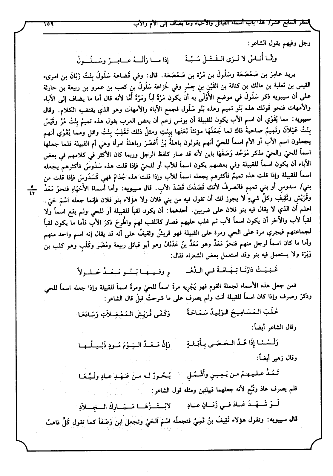 يُرِيد عامِرَ بن صَعْصَعَة وسَلُولَ بن مُرَّة بن صَعْصَعَة قَالَ: وَفِي قُضاعة سَلُولُ بِنْتُ زَبَّانَ بن امْرِئ الْقَيْس بن ثَعْلَبَة بن مَالك بن كنَانَة بن القَيْنِ بنِ جِسْرٍ وَفِي خُزاعة سَلُولُ بن كَعْب بن عَمْرو بن ربيعَة بن حَارِثَة على أَن سِيبَوَيْهٍ ذكر سَلُولَ فِي مَوضِع الأَوْلَى بِهِ أَن يكون مَرَّةً أَبَا ومَرَّةٌ أُمًّا لِأَنَّهُ قَالَ أما مَا يُضَاف إِلَى الْآبَاء والأمهات فنحو قَوْلك هَذِه بَنُو تَمِيم وَهَذِه بَنُو سَلُول فَجمع الآباءَ والأمهات وَهُوَ الَّذِي يَقْتَضِيهِ الْكَلَام وَقَالَ سِيبَوَيْهٍ: مِمَّا يُقَوِّي أَن اسْم الْأَب يكون للقبيلة أَن يُونُس زعم أَن بعض الْعَرَب يَقُول هَذِه تميمُ بِنْتُ مُرٍّ وقَيْسُ بِنْتُ عَيْلاَنَ وتَمِيمُ صاحبةُ ذَاك لما جَعَلَهَا مؤنثاً نَعَتَها بِبِنْتِ ومثلُ ذَلِك تَغْلِبُ بِنْتُ وَائِل وَمِمَّا يُقَوِّي أَنهم يجْعَلُونَ اسْم الْأَب أَو الْأُم اسْما للحيّ أَنهم يَقُولُونَ باهلةُ بْنُ أَعْصُرَ وباهلةُ امْرَأَة وَهِي أم الْقَبِيلَة فَلَمَّا جعلهَا اسْما للحيّ والحيّ مُذَكّر مُوَحَّد وصَفَهَا بِابْن لِأَنَّهُ قد صَار كَلَفْظِ الرجل وَرُبمَا كَانَ الْأَكْثَر فِي كَلَامهم فِي بعض الْآبَاء أَن يكون اسْما للقبيلة وَفِي بَعضهم يكون اسْما للْأَب أَو للحيّ فَإِذا قلت هَذِه سَدُوسُ فأكثرهم يَجعله اسْما للقبيلة وَإِذا قلت هَذِه تميمٌ فأكثرهم يَجعله اسْما للْأَب وَإِذا قلت هَذِه جُذامُ فَهِيَ كَسَدُوسَ فَإِذا قلت من بني سدوسٍ أَو بني تميمٍ فالصرفُ لِأَنَّك قَصَدْتَ قَصْدَ الأبِ قَالَ سِيبَوَيْهٍ: وَأما أسماءُ الأَحْيَاءِ فنحوُ مَعَدِّ وقُرَيْشٍ وثَقِيفٍ وكلِّ شيءٍ لَا يجوز لَك أَن تَقول فِيهِ من بني فلَان وَلَا هَؤُلَاءِ بَنو فلَان فَإِنَّمَا جعله اسْمَ حَيّ الْعم أَن الَّذِي لَا يُقَال فِيهِ بَنو فلَان على ضَرْبَيْنِ أَحدهمَا: أَن يكون لقباً للقبيلة أَو للحي وَلم يَقع اسْما وَلَا لقباً لأَب وَالْآخر أَن يكون اسْما لأَب ثمَّ غلب عَلَيْهِم فَصَارَ كاللقب لَهُم واطُّرِحَ ذكرُ الْأَب فَأَما مَا يكون لقباً لجماعتهم فَيجْرِي مرّة على الْحَيّ وَمرَّة على الْقَبِيلَة فَهُوَ قريشٌ وثقيفٌ على أَنه قد يُقَال إِنَّه اسْم وَاحِد مِنْهُم وَأما مَا كَانَ اسْما لرجل مِنْهُم فنحوُ مَعَدٍّ وَهُوَ مَعَدُّ بنُ عَدْنَانَ وَهُوَ أَبُو قبائل ربيعَة ومُضَر وكَلْبٍ وَهُوَ كلب بن وَبْرَة وَلَا يسْتَعْمل فِيهِ بَنو وَقد اسْتعْمل بعض الشُّعَرَاء فَقَالَ: