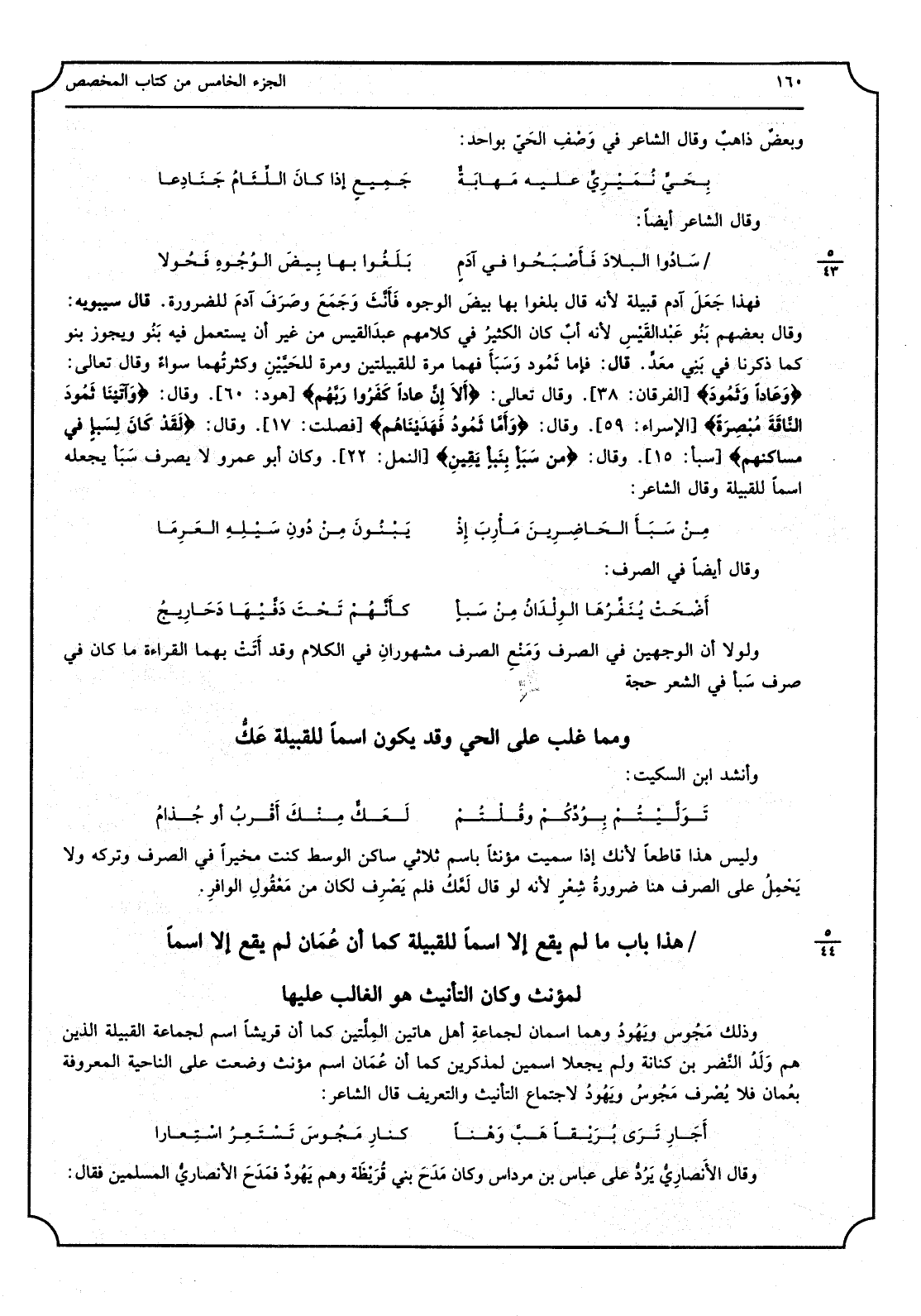 فَهَذَا جَعَلَ آدم قَبيلَة لِأَنَّهُ قَالَ بلغُوا بهَا بيضَ الْوُجُوه فَأَنَّثَ وَجَمَعَ وصَرَفَ آدمَ للضَّرُورَة قَالَ سِيبَوَيْهٍ: وَقَالَ بَعضهم بَنُو عَبْد القَيْسِ لِأَنَّهُ أبٌ كَانَ الكثيرُ فِي كَلَامهم عبدَ الْقَيْس من غير أَن يسْتَعْمل فِيهِ بَنُو وَيجوز بَنو كَمَا ذكرنَا فِي بَنِي معَدٍّ قَالَ: فإمَّا ثَمُود وَسَبَأَ فهما مرّة للقبيلتين وَمرَّة للحَيَّيْنِ وكثرتُهما سواءٌ وَقَالَ تَعَالَى: {وَعَاداً وَثَمُودَ} [الْفرْقَان: 38] وَقَالَ تَعَالَى: {أَلاَ إِنَّ عاداً كَفَرُوا رَبَّهُم} [هود: 60] وَقَالَ: {وَآتَيْنَا ثَمُودَ النَّاقَةَ مُبْصِرَةً} [الْإِسْرَاء: 59] وَقَالَ: {وَأَمَّا ثَمُودُ فَهَدَيْنَاهُم} [فصلت: 17] وَقَالَ: {لَقَدْ كَانَ لِسَبإٍ فِي مساكنهم} [سبأ: 15] وَقَالَ: {من سَبَأٍ بِنَبأٍ يَقِينِ} [النَّمْل: 22] وَكَانَ أَبُو عَمْرو لَا يصرف سَبَأ يَجعله اسْما للقبيلة وَقَالَ الشَّاعِر: