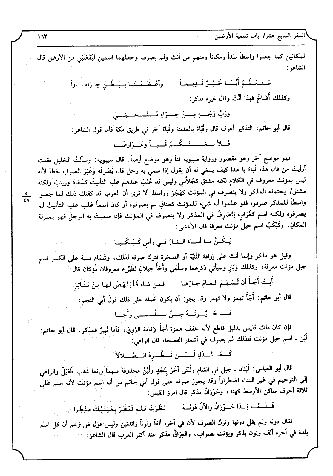 فَقَالَ دونه وَلم يقل دونهَا وَترك الصّرْف لِأَن فِي آخِره ألفا ونوناً زائدتين وَلَيْسَ قَول من زعم أَن كل اسْم بَلْدَة فِي آخِره ألف وَنون يذكر وَيُؤَنث بصواب والعِرَاقُ مُذَكّر عِنْد أَكثر الْعَرَب قَالَ الشَّاعِر: