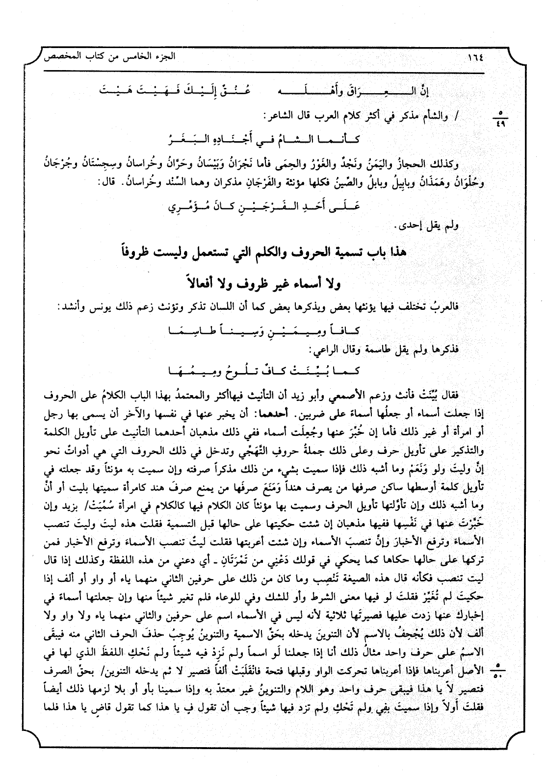 فَقَالَ بُيِّنَتْ فَأَنت وَزعم الْأَصْمَعِي وَأَبُو زيد أَن التَّأْنِيث فِيهَا أَكثر والمعتمدُ بِهَذَا الْبَاب الكلامُ على الْحُرُوف إِذا جعلت أَسمَاء أَو جعلُها أَسمَاء على ضَرْبَيْنِ أَحدهمَا: أَن يخبر عَنْهَا فِي نَفسهَا وَالْآخر أَن يُسمى بهَا رجل أَو امْرَأَة أَو غير ذَلِك فَأَما إِن خُبِّرَ عَنْهَا وجُعِلَت أَسمَاء فَفِي ذَلِك مذهبان أَحدهمَا التَّأْنِيث على تَأْوِيل الْكَلِمَة والتذكير على تَأْوِيل حرف وعَلى ذَلِك جملةُ حروفِ التَّهَجِّي وَتدْخل فِي ذَلِك الْحُرُوف الَّتِي هِيَ أدواتٌ نَحْو إنَّ وليتَ وَلَو وَنَعَمْ وَمَا أشبه ذَلِك فَإِذا سميت بِشَيْء من ذَلِك مذكراً صرفته وَإِن سميت بِهِ مؤنثاً وَقد جعلته فِي تَأْوِيل كلمة أوسطها سَاكن صرفهَا من يصرف هنداً وَمَنَعَ صرفَها من يمْنَع صرفَ هِنْد كامرأة سميتها بليت أَو أنَّ وَمَا أشبه ذَلِك وَإِن تأوَّلتها تَأْوِيل الْحَرْف وَسميت بهَا مؤنثاً كَانَ الْكَلَام فِيهَا كَالْكَلَامِ فِي امْرَأَة سُمِّيَتْ بزيد وَإِن خَبَّرْتَ عَنْهَا فِي نَفْسِها فَفِيهَا مذهبان إِن شِئْت حكيتها على حَالهَا قبل التَّسْمِيَة فَقلت هَذِه ليتَ وليتَ تنصب الأسماءَ وترفع الأخبارَ وإنَّ تنصبَ الْأَسْمَاء وَإِن شِئْت أعربتها فَقلت ليتٌ تنصب الأسماءَ وترفع الْأَخْبَار فَمن تَركهَا على حَالهَا حَكَاهَا كَمَا يَحْكِي فِي قَوْلك دَعْنِي من تَمْرَتَانِ - أَي دَعْنِي من هَذِه اللَّفْظَة وَكَذَلِكَ إِذا قَالَ لَيْت تنصب فَكَأَنَّهُ قَالَ هَذِه الصِّيغَة تَنْصِب وَمَا كَانَ من ذَلِك على حرفين الثَّانِي مِنْهُمَا يَاء أَو وَاو أَو ألف إِذا حيكتَ لم تُغَيِّرْ فقلتَ لَو فِيهَا معنى الشَّرْط وأو للشَّكّ وَفِي للوعاء فَلم تغير شَيْئا مِنْهَا وَإِن جَعلتهَا أَسمَاء فِي إخبارك عَنْهَا زِدْت عَلَيْهَا فصيرتَها ثلاثية لِأَنَّهُ لَيْسَ فِي الْأَسْمَاء اسْم على حرفين وَالثَّانِي مِنْهُمَا يَاء وَلَا وَاو وَلَا ألف لِأَن ذَلِك يُجْحِفُ بِالِاسْمِ لِأَن التنوينَ يدْخلهُ بحَقِّ الاسمية والتنوينُ يُوجِبُ حذفَ الْحَرْف الثَّانِي مِنْهُ فيبقَى الاسمُ على حرف وَاحِد مثالُ ذَلِك أَنا إِذا جعلنَا لَو اسْما وَلم نَزِدْ فِيهِ شَيْئا وَلم نَحْكِ اللفظَ الَّذِي لَهَا فِي الأَصْل أعربناها فَإِذا أعربناها تحركت الْوَاو وَقبلهَا فَتْحة فانْقَلَبَتْ ألفا فَتَصِير لَا ثمَّ يدْخلهُ التَّنْوِين بحقِّ الصّرْف فَتَصِير لَا يَا هَذَا فَيبقى حرف وَاحِد وَهُوَ اللَّام والتنوينُ غير معتدّ بِهِ وَإِذا سمينا بِأَو أَو بِلَا لَزِمَهَا ذَلِك أَيْضا فقلتَ أَولاً وَإِذا سميتَ بفِي وَلم تَحْكِ وَلم تزد فِيهَا شَيْئا وَجب أَن تَقول فٍ يَا هَذَا كَمَا تَقول قاضٍ يَا هَذَا فَلَمَّا