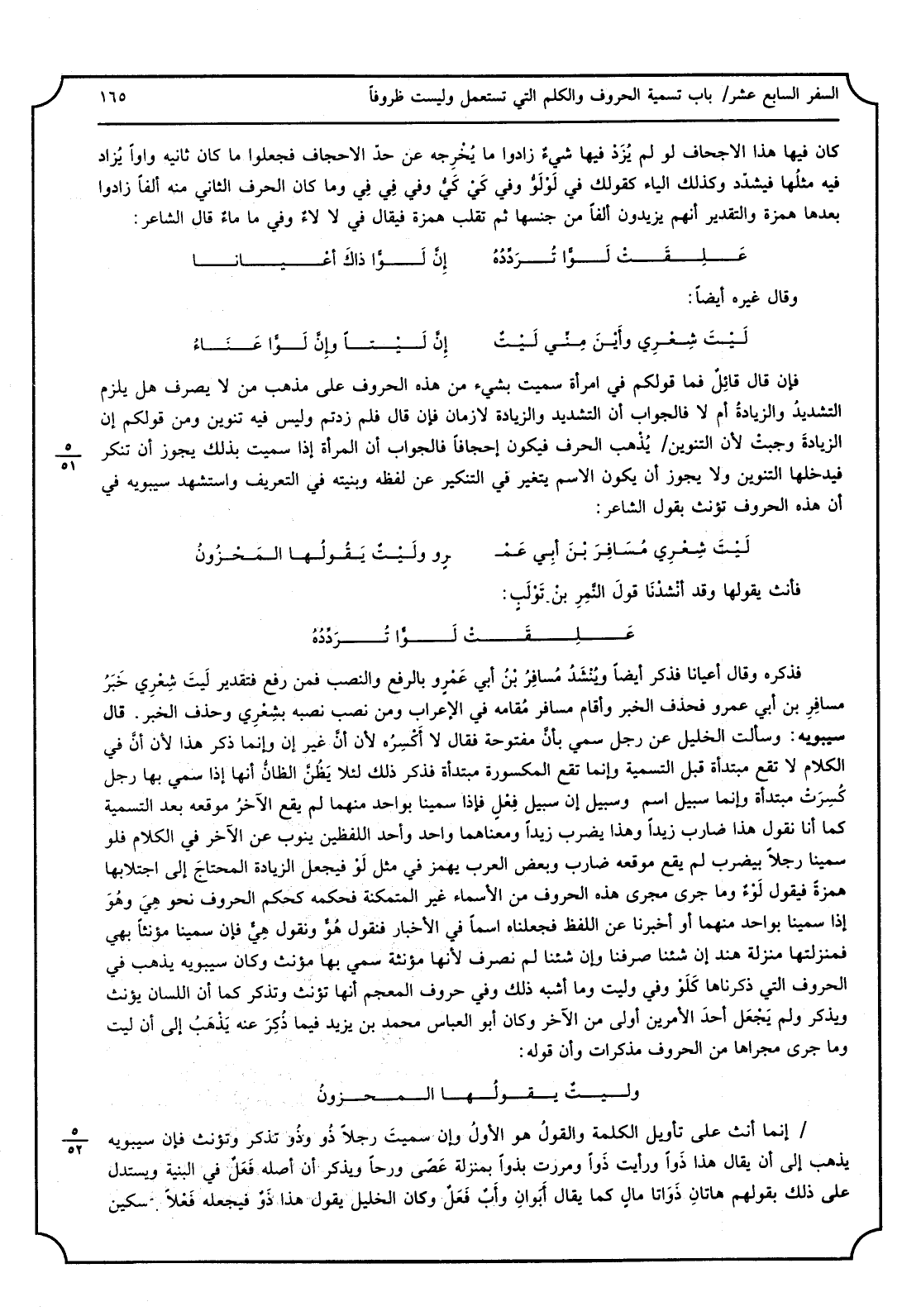 فَذكره وَقَالَ أعيانا فَذكر أَيْضا ويُنْشَدُ مُسافِرُ بْنُ أبي عَمْروٍ بِالرَّفْع وَالنّصب فَمن رفع فتقدير لَيتَ شِعْرِي خَبَرُ مسافِرِ بن أبي عَمْرو فَحذف الْخَبَر وَأقَام مُسَافر مُقامه فِي الْإِعْرَاب وَمن نصب نَصبه بشِعْرِي وَحذف الْخَبَر قَالَ سِيبَوَيْهٍ: وَسَأَلت الْخَيل عَن رجل سمي بأنَّ مَفْتُوحَة فَقَالَ لَا أَكْسِرُه لِأَن أنَّ غير إِن وَإِنَّمَا ذكر هَذَا لِأَن أنِّ فِي الْكَلَام لَا تقع مُبتَدأَة قبل التَّسْمِيَة وَإِنَّمَا تقع الْمَكْسُورَة مُبتَدأَة فَذكر ذَلِك لِئَلَّا يَظُنَّ الظانُّ أَنَّهَا إِذا سمي بهَا رجل كُسِرَتْ مُبتَدأَة وَإِنَّمَا سَبِيل اسْم وسبيل إِن سَبِيل فِعْلِ فَإِذا سمينا بِوَاحِد مِنْهُمَا لم يَقع الآخرُ موقعه بعد التَّسْمِيَة كَمَا أَن نقُول هَذَا ضَارب زيدا وَهَذَا يضْرب زيدا ومعناهما وَاحِد وَأحد اللَّفْظَيْنِ يَنُوب عَن الآخر فِي الْكَلَام فَلَو سمينا رجلا بيضرب لم يَقع موقعه ضَارب وَبَعض الْعَرَب يهمز فِي مثل لَوْ فَيجْعَل الزِّيَادَة المحتاجَ إِلَى اجتلابها همزَة فَيَقُول لَوْءٌ وماجرى مجْرى هَذِه الْحُرُوف من الْأَسْمَاء غير المتمكنة فَحكمه حكم الْحُرُوف نَحْو هِيَ وهُوَ إِذا سمينا بِوَاحِد مِنْهُمَا أَو أخبرنَا عَن اللَّفْظ فجعلناه اسْما فِي الْأَخْبَار فَنَقُول هُوٌّ ونقول هِيٌّ فَإِن سمينا مؤنثاً بهي فمنزلتها منزلَة هِنْد إِن شِئْنَا صرفنَا وَإِن شِئْنَا لم نصرف لِأَنَّهَا مُؤَنّثَة سمي بهَا مؤنث وَكَانَ سِيبَوَيْهٍ يذهب فِي الْحُرُوف الَّتِي ذَكرنَاهَا كَلَوْ وَفِي وليت وَمَا أشبه ذَلِك وَفِي حُرُوف المعجم أَنَّهَا تؤنث وتذكر كَمَا أَن اللِّسَان يؤنث وَيذكر وَلم يَجْعَل أحدَ الْأَمريْنِ أولى من الآخر وَكَانَ أَبُو الْعَبَّاس مُحَمَّد بن يزِيد فِيمَا ذُكِرَ عَنهُ يَذْهَبُ إِلَى أَن لَيْت وَمَا جرى مجْراهَا من الْحُرُوف مذكرات وَأَن قَوْله: