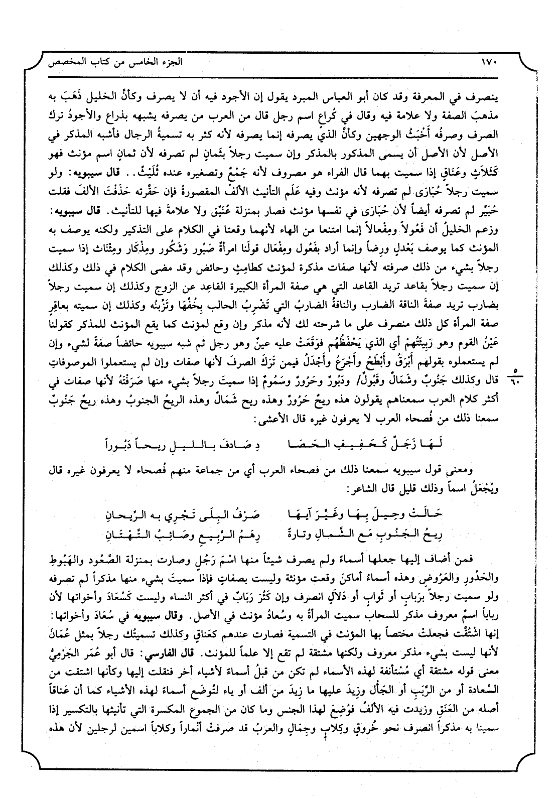 ينْصَرف فِي الْمعرفَة وَقد كَانَ أَبُو الْعَبَّاس الْمبرد يَقُول إِن الأجود فِيهِ أَن لَا يصرف وكأنَّ الْخَلِيل ذَهَبَ بِهِ مذهبَ الصّفة وَلَا عَلامَة فِيهِ وَقَالَ فِي كُراعٍ اسْم رجل قَالَ من الْعَرَب من يصرفهُ يُشبههُ بِذِرَاع والأجودُ ترك الصّرْف وصرفُه أَخْبَثُ الْوَجْهَيْنِ وكأنَّ الَّذِي يصرفهُ إِنَّمَا يصرفهُ لِأَنَّهُ كثر بِهِ تسميةُ الرِّجَال فَأشبه الْمُذكر فِي الأَصْل لِأَن الأَصْل أَن يُسمى الْمَذْكُور بالمذكر وَإِن سميت رجلا بثَمانٍ لم تصرفه لِأَن ثمانٍ اسْم مؤنث فَهُوَ كَثَلاَثٍ وعَنَاقٍ إِذا سميت بهما قَالَ الْفراء هُوَ مَصْرُوف لِأَنَّهُ جَمْعٌ وتصغيره عِنْده ثُلَيْثٌ قَالَ سِيبَوَيْهٍ: وَلَو سميت رجلا حُبَارَى لم تصرفه لِأَنَّهُ مؤنث وَفِيه عَلَم التَّأْنِيث الألفُ المقصورةُ فَإِن حَقَّرته حَذَفْتَ الألفَ فَقلت حُبَيِّر لم تصرفه أَيْضا لِأَن حُبَارَى فِي نَفسهَا مؤنث فَصَارَ بِمَنْزِلَة عُنَيِّق وَلَا علامةَ فِيهَا للتأنيث قَالَ سِيبَوَيْهٍ: وَزعم الخليلُ أَن فَعُولاً ومِفْعالاً إِنَّمَا امتنعا من الْهَاء لِأَنَّهُمَا وقعتا فِي الْكَلَام على التَّذْكِير وَلكنه يُوصف بِهِ الْمُؤَنَّث كَمَا يُوصف بَعْدلٍ ورِضاً وَإِنَّمَا أَرَادَ بفَعُول ومِفْعَال قولَنا امرأةٌ صَبُور وَشَكُور ومِذْكَار ومِئْنَاث إِذا سميت رجلا بِشَيْء من ذَلِك صرفته لِأَنَّهَا صِفَات مذكرة لمؤنث كطامِثٍ وحائض وَقد مضى الْكَلَام فِي ذَلِك وَكَذَلِكَ إِن سميت رجلا بقاعد تُرِيدُ الْقَاعِد الَّتِي هِيَ صفة الْمَرْأَة الْكَبِيرَة القاعِد عَن الزَّوْج وَكَذَلِكَ إِن سميت بعاقِرٍ صفة الْمَرْأَة كل ذَلِك منصرف على مَا شرحته لَك لِأَنَّهُ مُذَكّر وَإِن وَقع لمؤنث كَمَا يَقع الْمُؤَنَّث للمذكر كَقَوْلِنَا عَيْنُ الْقَوْم وَهُوَ رَبِيئَتُهمْ أَي الَّذِي يَحْفَظُهُم فوَقَعَتْ عَلَيْهِ عينٌ وَهُوَ رجل ثمَّ شبه سِيبَوَيْهٍ حَائِضًا صفةٌ لشَيْء وَإِن لم يستعملوه بقَوْلهمْ أَبْرَقُ وأَبْطَحُ وأَجْزَعُ وأَجْدَلُ فِيمَن تَرَكَ الصرفَ لِأَنَّهَا صِفَات وَإِن لم يستعملوا الموصوفاتِ قَالَ وَكَذَلِكَ جَنُوبٌ وشَمَالٌ وقَبُولٌ ودَبُورٌ وحَرُورٌ وسَمُومٌ إِذا سمتَ رجلا بِشَيْء مِنْهَا صَرَفْتَهُ لِأَنَّهَا صِفَات فِي أَكثر كَلَام الْعَرَب سمعناهم يَقُولُونَ هَذِه ريحٌ حَرُورٌ وَهَذِه ريح شَمَالٌ وَهَذِه الريحُ الجنوبُ وَهَذِه ريحٌ جَنُوبٌ سمعنَا ذَلِك من فُصحاء الْعَرَب لَا يعْرفُونَ غَيره قَالَ الْأَعْشَى: