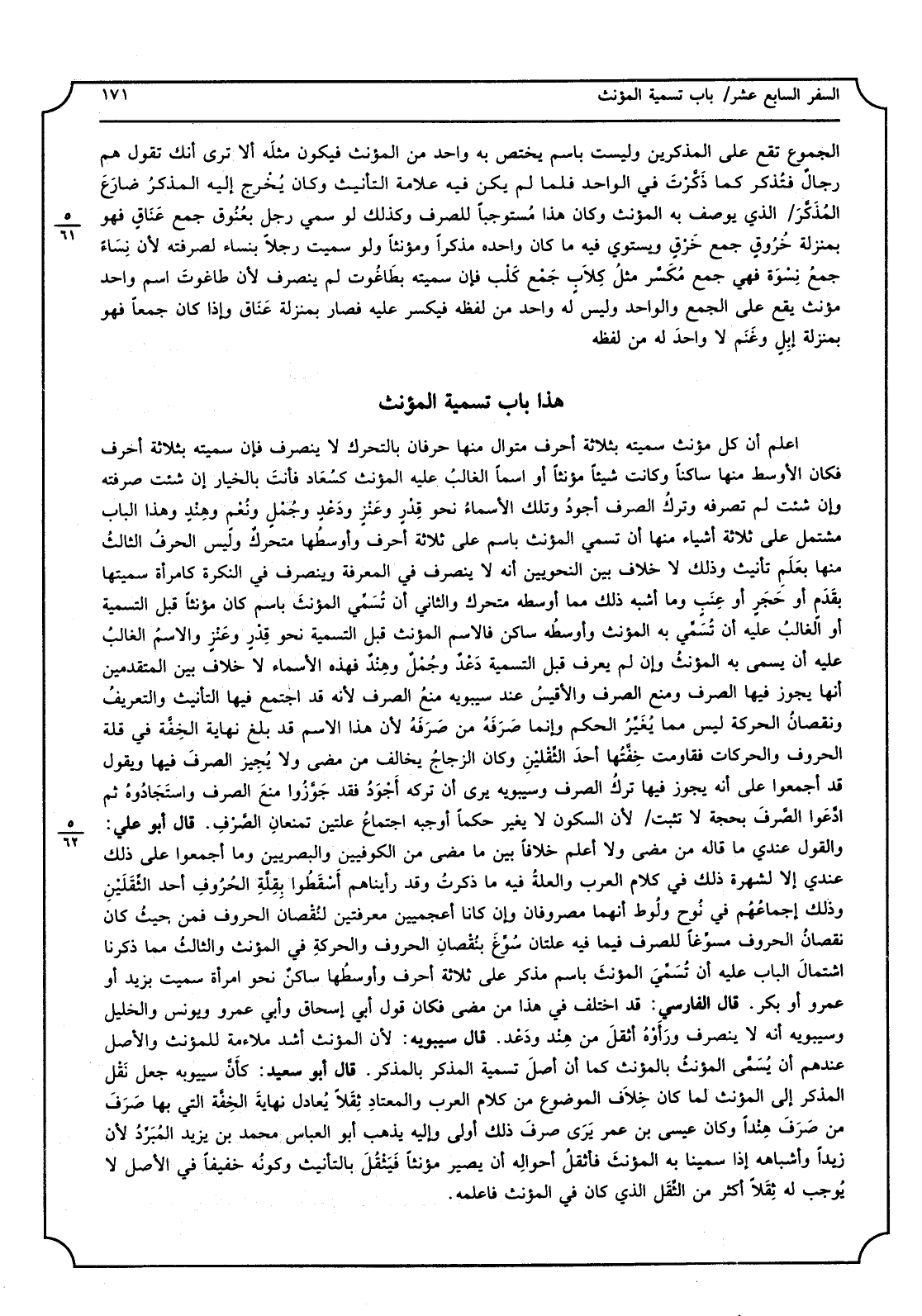 اعْلَم أَن كل مؤنث سميته بِثَلَاثَة أحرف متوال مِنْهُ حرفان بالتحرك لَا ينْصَرف فَإِنَّهُ سميته بِثَلَاثَة أحرف فَكَانَ الْأَوْسَط مِنْهَا سَاكِنا وَكَانَت شَيْئا مؤنثاً أَو اسْما الغالبُ عَلَيْهِ الْمُؤَنَّث كسُعَاد فأنتَ بِالْخِيَارِ إِن شِئْت صرفته وَإِن شِئْت لم تصرفه وتركُ الصرفُ أجودُ وَتلك الأسماءُ نَحْو قِدْرٍ وعَنْزٍ ودَعْدٍ وجُمْلٍ ونُغْمٍ وهِنْدٍ وَهَذَا الْبَاب مُشْتَمل على ثَلَاثَة أَشْيَاء مِنْهَا أَن تسمي الْمُؤَنَّث باسم على ثَلَاثَة أحرف وأوسطُها متحركق وَلَيْسَ الحرفُ الثالثُ مِنْهَا بعَلَم تَأْنِيث وَذَلِكَ لَا خلاف بَين النَّحْوِيين أَنه لَا ينْصَرف فِي الْمعرفَة وينصرف فِي النكرَة كامرأة سميتها بقَدَم أَو حَجَر أَو عِنَبٍ وَمَا أشبه ذَلِك مِمَّا أوسطه متحرك وَالثَّانِي أَن تُسَمِّي المؤنثَ باسم كَانَ مؤنثاً قبل التَّسْمِيَة أَو الغالبُ عَلَيْهِ أَن تُسَمِّي بِهِ الْمُؤَنَّث وأوسطُه سَاكن فالاسم الْمُؤَنَّث قبل التَّسْمِيَة نَحْو قِدْرٍ وعَنْزٍ والاسمُ الغالبُ عَلَيْهِ أَن يُسمى بِهِ المؤنثُ وَإِن لم يعرف قبل التَّسْمِيَة دَعْدٌ وجُمْلٌ وهِنْدٌ فَهَذِهِ الْأَسْمَاء لَا خلاف بَين الْمُتَقَدِّمين أَنَّهَا يجوز فِيهَا الصّرْف وَمنع الصّرْف والأقيسُ عِنْد سِيبَوَيْهٍ منعُ الصّرْف لِأَنَّهُ قد اجْتمع فِيهَا التَّأْنِيث والتعريفُ ونقصانُ الْحَرَكَة لَيْسَ مِمَّا يُغَيِّرُ الحكم وَإِنَّمَا صَرَفَهث من صَرَفَهُ لِأَن هَذَا الِاسْم قد بلغ نِهَايَة الخِفَّة فِي قلَّة الْحُرُوف والحركات فقاومت خِفَّتُها أحدَ الثَّقْليْنِ وَكَانَ الزجاجُ يُخَالف من مضى وَلَا يُجِيز الصرفَ فِيهَا وَيَقُول قد أَجمعُوا على أَنه يجوز فِيهَا تركُ الصّرْف وسيبويه يرى أَن ترك أَجْوَدُ فقد جَوَّزُوا منعَ الصّرْف واستَجَادُوهُ ثمَّ ادَّعَوا الصَّرفَ بِحجَّة لَا تثبت لِأَن السّكُون لَا يُغير حكما أوجبه اجتماعُ علتين تمنعانِ الصَّرْفِ قَالَ أَبُو عَليّ: وَالْقَوْل عِنْدِي مَا قَالَه من مضى وَلَا أعلم خلافًا بَين مَا مضى من الْكُوفِيّين والبصريين وَمَا أجمعواعلى ذَلِك عِنْدِي إِلَّا لشهرة ذَلِك فِي كَلَام الْعَرَب والعلةُ فِيهِ مَا ذكرتُ وَقد رأيناهم أَسْقَطُوا بِقِلَّةِ الحُرُوفِ أحد الثَّقْلَيْنِ وَذَلِكَ إجماعُهُم فِي نُوح ولُوط أَنَّهُمَا مصروفان وَإِن كَانَت أعجميين معرفتين لنُقْصان الْحُرُوف فَمن حيثُ كَانَ نقصانُ الْحُرُوف مسوِّغاً للصرف فِيمَا فِيهِ عِلَّتَانِ سُوِّغَ بنُقْصانِ الْحُرُوف والحركةِ فِي الْمُؤَنَّث والثالثُ مِمَّا ذكرنَا اشتمالَ الْبَاب عَلَيْهِ أَن تُسَمِّيَ المؤنثَ باسم مُذَكّر على ثَلَاثَة أحرف وأوسطُها ساكنٌ نَحْو امْرَأَة سميت بزيد أَو عَمْرو أَو بكر قَالَ الْفَارِسِي: قد اخْتلف فِي هَذَا من مضى فَكَانَ قَول أبي إِسْحَاق وَأبي عَمْرو وَيُونُس والخليل وسيبويه أَنه لَا ينْصَرف ورَأَوْهُ أثقلَ من هِنْد ودَعْد قَالَ سِيبَوَيْهٍ: لِأَن الْمُؤَنَّث أَشد ملاءمة للمؤنث وَالْأَصْل عِنْدهم أَن يُسَمَّى الْمُؤَنَّث بالمؤنث كَمَا أَن أصلَ تَسْمِيَة الْمُذكر بالمذكر قَالَ أَبُو سعيد: كأَنَّ سِيبَوَيْهٍ جعل نَقْل الْمُذكر إِلَى الْمُؤَنَّث مَا كَانَ خِلاَف الْمَوْضُوع فِي كَلَام الْعَرَب والمعتادِ ثِقَلاً يُعادل نهايةَ الخِفَّة الَّتِي بهَا صَرَفَ من صَرَفَ هِنْداً وَكَانَ عِيسَى بن عمر يَرَى صرفَ ذَلِك أولى وَإِلَيْهِ يذهب أَبُو الْعَبَّاس مُحَمَّد بن يزِيد المَبَرّدُ لِأَن زيدا وأشباهه إِذا سمينا بِهِ الْمُؤَنَّث فأثقلُ أحوالِه أَن يصير مؤنثاً فَيَثْقُلَ بالتأنيث وكونُه فِي الأَصْل لَا يُوجب لَهُ ثِقَلاً أَكثر من الثِّقَل الَّذِي كَانَ فِي الْمُؤَنَّث فاعلمه