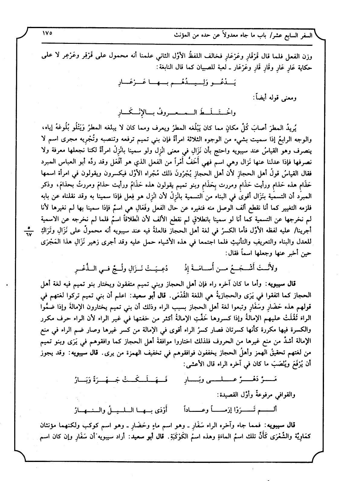 قَالَ سِيبَوَيْهٍ: وَأما مَا كَانَ آخِره رَاء فَإِن أهل الْحجاز وَبني تَمِيم متفقون ويختار بَنو تَمِيم فِيهِ لُغَة أهل الْحجاز كَمَا اتَّفقُوا فِي يَرَى والحجازيةُ هِيَ اللُّغَة القُدْمَى قَالَ أَبُو سعيد: اعْلَم أَن بني تَمِيم تركُوا لغتهم فِي قَوْلهم هَذِه حَضَارِ وسَفَارِ وتبعوا لُغَة أهل الْحجاز بِسَبَب الرَّاء وَذَلِكَ أَن بني تَمِيم يختارون الإمالةَ وَإِذا ضمُّوا الرَّاء ثَقُلَتْ عَلَيْهِم الإمالةُ وَإِذا كسروها خَفَّتِ الإمالةُ أَكثر من خفتها فِي غير الرَّاء لِأَن الرَّاء حرف مُكَرر والكسرة فِيهَا مكررة كَأَنَّهَا كسرتان فَصَارَ كسرُ الرَّاء أقوى فِي الإمالة من كسر غَيرهَا وَصَارَ ضم الرَّاء فِي منع الإمالة أشدَّ من منع غَيرهَا من الْحُرُوف فَلذَلِك اخْتَارُوا موافقةَ أهل الْحجاز كَمَا وافقوهم فِي يَرَى وَبَنُو تَمِيم من لغتهم تحقيقُ الْهَمْز وأهلُ الْحجاز يخففون فوافقوهم فِي تَخْفيف الْهمزَة من يرى قَالَ سيبوين: وَقد يجوز أَن يُرْفَعَ ويُنْصَبَ مَا كَانَ فِي آخِره الرَّاء قَالَ الْأَعْشَى: