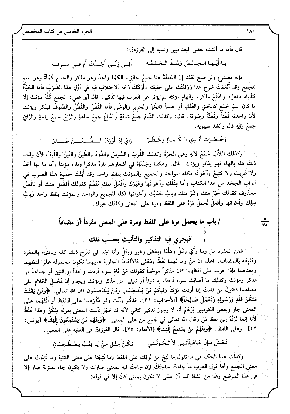 1 - بَاب مَا يحمل مرّة على اللَّفْظ وَمرَّة على الْمَعْنى مُفردا أَو مُضَافا فَيجْرِي فِيهِ التَّذْكِير والتأنيث بِحَسب ذَلِك
