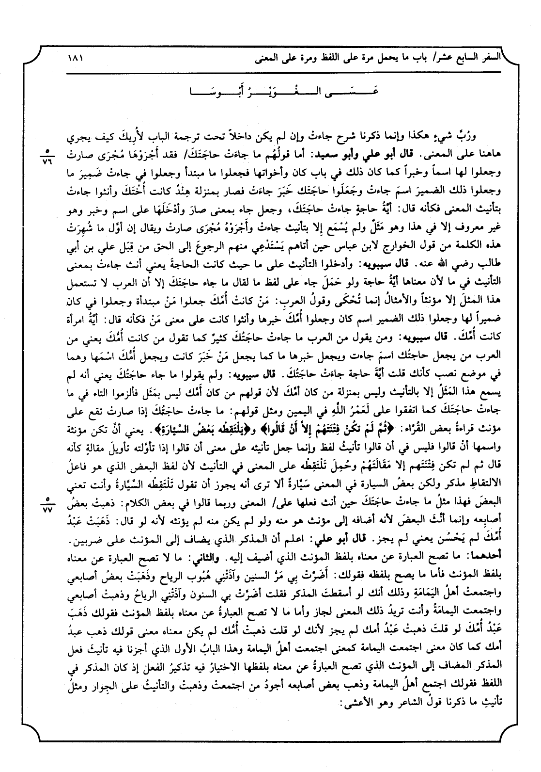 ورُبَّ شيءٍ هَكَذَا وَإِنَّمَا ذكرنَا شرح جاءتْ وَإِن لم يكن دَاخِلا تَحت تَرْجَمَة الْبَاب لأُرِيكَ كَيفَ يجْرِي هَاهُنَا على الْمَعْنى قَالَ أَبُو عَليّ وَأَبُو سعيد: أما قولُهُم مَا جاءَتْ حاجَتَكَ فقد أَجْرَوْهَا مُجْرَى صارتْ وَجعلُوا لَهَا اسْما وخبراً كَمَا كَانَ ذَلِك فِي بَاب كَانَ وَأَخَوَاتهَا فَجعلُوا مَا مُبْتَدأ وَجعلُوا فِي جاءتْ ضَميرَ مَا وَجعلُوا ذَلِك الضميرَ اسمَ جاءتْ وجَعلَوا حاجَتَك خَبَرَ جاءَتْ فَصَارَ بِمَنْزِلَة هِنْدٌ كَانَت أُخْتَكَ وأنثوا جاءتْ غير مَعْرُوف إِلَّا فِي هَذَا وَهُوَ مَثَلٌ وَلم يُسْمَع إِلا بتأنيث جاءتْ وأَجْرَوْهُ مُجْرَى صارتْ وَيُقَال إِن أوّل مَا شُهِرَتْ هَذِه الكملة من قَول الخوراج لِابْنِ عَبَّاس حِين أَتَاهُم يَسْتَدْعي مِنْهُم الرجوعَ إِلَى الْحق من قِبَل عَليّ بن أبي طَالب رَضِي الله عَنهُ قَالَ سِيبَوَيْهٍ: وأدخلوا التَّأْنِيث على مَا حَيْثُ كَانَت الحاجةَ يَعْنِي أنث جاءتْ بِمَعْنى التَّأْنِيث فِي مَا لِأَن مَعْنَاهَا أيَّةُ حَاجَة وَلَو حَمَلَ جَاءَ على لفظ مَا لقَالَ ماجاء حاجَتَكَ إِلَّا أَن الْعَرَب لَا تسْتَعْمل هَذَا المثلَ إِلَّا مؤنثاً والأمثالُ إِنَّمَا تُحْكَى وقولُ العربِ: مَنْ كانتْ أُمَّكَ جعلُوا مَنْ مُبتَدأَة وَجعلُوا فِي كَانَ ضميراً لَهَا وَجعلُوا ذَلِك الضَّمِير اسْم كَانَ وَجعلُوا أُمَّكَ خَبَرهَا وأنثوا كَانَت على معنى مَنْ فَكَأَنَّهُ قَالَ: أيَّةُ امْرَأَة كَانَت أُمَّكَ قَالَ سِيبَوَيْهٍ: وَمن يَقُول من الْعَرَب مَا جاءتْ حاجَتُكَ كثيرٌ كَمَا تَقول من كَانَت أُمُّكَ يَعْنِي من الْعَرَب من يَجْعَل حاجتُك اسمَ جَاءَت وَيجْعَل خَبَرهَا مَا كَانَ يَجْعَل مَنْ خَبَرَ كَانَت وَيجْعَل أُمُّكَ اسْمَها وهما فِي مَوضِع نصب كَأَنَّك قلت أيَّةُ حَاجَة جاءَتْ حاجَتُكَ قَالَ سِيبَوَيْهٍ: وَلم يَقُولُوا مَا جَاءَ حاجَتُكَ يَعْنِي أَنه لم يسمع هَذَا المَثَلُ إِلَّا بالتأنيث وَلَيْسَ بِمَنْزِلَة من كَانَ أمَّكَ لِأَن قَوْلهم من كَانَ أَمَّك لَيْسَ بمَثَل فألزموا التَّاء فِي مَا جاءتْ حاجَتَكَ كَمَا اتفوقا على لَعَمْرُ اللهِ فِي الْيَمين وَمثل قَوْلهم: مَا جاءتْ حاجَتُكَ إِذا صارتْ تقع على مؤنث قراءةُ بعض القُرِّاء: {ثُمَّ لَمْ تكُنْ فِتْنَتَهُمْ إِلاَّ أَنْ قَالُوا} و {يَلْتَقِطْه بَعْضُ السَّيَّارَةِ} يَعْنِي أنَّ تكن مُؤَنّثَة وَاسْمهَا أنْ قَالُوا فَلَيْسَ فِي أَن قَالُوا تأنيثُ لفظ وَإِنَّمَا جعل تأنيثه على معنى أَن قَالُوا إِذا تأوَّلته تأويلَ مقالةٍ كَأَنَّهُ قَالَ ثمَّ لم تكن فِتْنَتَهم إِلَّا مَقَالَتَهُمْ وحُمِلَ تَلْتَقِطُه على الْمَعْنى فِي التَّأْنِيث لِأَن لفظ الْبَعْض الَّذِي هُوَ فاعلُ الالتقاطِ مُذَكّر وَلَكِن بعضُ السيارة فِي الْمَعْنى سَيَّارةٌ أَلا ترى أَنه يجوز أَن تَقول تَلْتَقِطْه السَّيَّارةُ وَأَنت تَعْنِي البعضَ فَهَذَا مثلُ مَا جاءتْ حاجَتَكَ حِين أنث فعلهَا على الْمَعْنى وَرُبمَا قَالُوا فِي بعض الْكَلَام: ذهبتْ بعضُ أصابِعه وَإِنَّمَا أنَّثَ البعضَ لِأَنَّهُ أَضَافَهُ إِلَى مؤنث هُوَ مِنْهُ وَلم لم يكن مِنْهُ لم يؤنثه لِأَنَّهُ لَو قَالَ: ذَهَبَتْ عَبْدُ أُمِّكَ لم يَحْسُن يَعْنِي لم يجز قَالَ أَبُو عَليّ: اعْلَم أَن الْمُذكر الَّذِي يُضَاف إِلَى الْمُؤَنَّث على ضَرْبَيْنِ أَحدهمَا: مَا تصح الْعبارَة عَن مَعْنَاهُ بِلَفْظ الْمُؤَنَّث الَّذِي أضيف إِلَيْهِ وَالثَّانِي: مَا لَا تصح الْعبارَة عَن مَعْنَاهُ بِلَفْظ الْمُؤَنَّث فَأَما مَا يَصح بِلَفْظِهِ فقولك: أَضَرَّتْ بِي مَرُّ السنين وآذَتْنِي هُبُوب الرِّيَاح وذَهَبَتْ بعضُ أصابعي واجتمعتْ أهلُ اليَمَامَةِ وَذَلِكَ أَنَّك لَو أسقطتَ الْمُذكر فَقلت أضَرَّتْ بِي السنون وآذَتْنِي الرياحُ وذهبتْ أصابعي وَاجْتمعت اليمامَةُ وَأَنت تُرِيدُ ذَلِك الْمَع