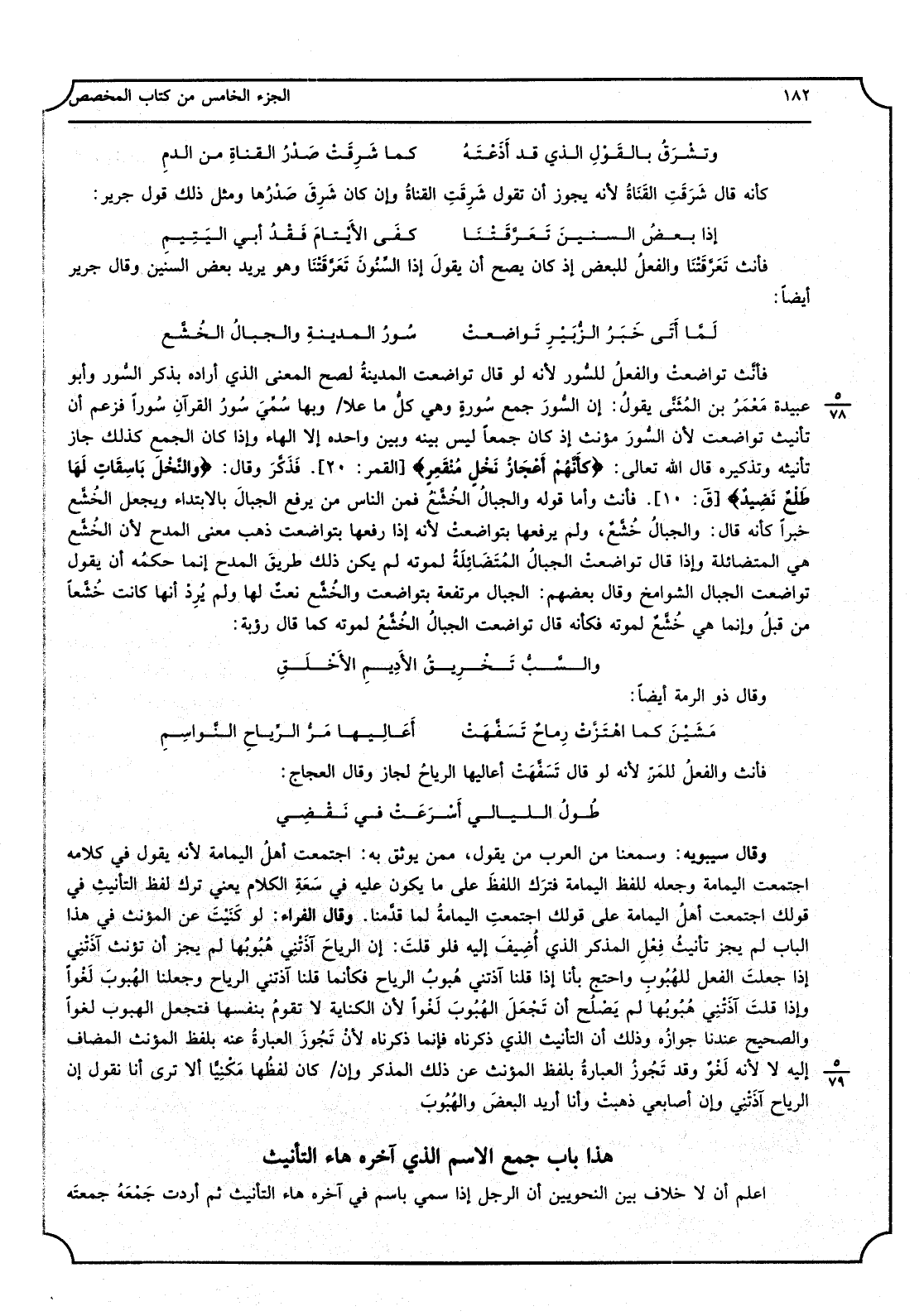 فأنَّث تواضعتْ والفعلُ للسُّور لِأَنَّهُ لَو قَالَ تواضعت المدينةُ لصَحَّ الْمَعْنى الَّذِي أَرَادَهُ بِذكر السُّور وَأَبُو عُبَيْدَة مَعْمَرُ بن المُثَنَّى يقولُ: إِن السُّورَ جمع سُورةٍ وَهِي كلُّ مَا علا وَبهَا سُمِّيَ سُورُ القرآنِ سُوراً فَزعم أَن تَأْنِيث تواضعت لِأَن السُّورَ مؤنث إِذْ كَانَ جمعا لَيْسَ بَينه وَبَين واحده إِلَّا الْهَاء وَإِذا كَانَ الْجمع كَذَلِك جَازَ تأنيثه وتذكيره قَالَ الله تَعَالَى: {كأَنَّهُمْ أَعْجَازُ نَخْلٍ مُنْقَعِرٍ} [الْقَمَر: 20] فَذَكَّرَ وقالك {والنَّخْلَ بَاسِقَاتٍ لَهَا طَلْعٌ نَضِيدٌ} [ق: 10] قأنث وَأما قَوْله والجبالُ الخُشَّعُ فَمن النَّاس من يرفع الجبالَ بِالِابْتِدَاءِ وَيجْعَل الخُشَّع خَبرا كانه قَالَ: والجبالُ خُشَّعٌ وَلم يرفعها بتواضعت لِأَنَّهُ إِذا رَفعهَا بتواضعت ذهب معنى الْمَدْح لِأَن الخُشَّع هِيَ المتضائلة وَإِذا قَالَ تواضعتْ الجبالُ المُتَضَائِلةُ لمَوْته لم يكن ذَلِك طريقَ الْمَدْح إِنَّمَا حكمُه أَن يَقُول تواضعت الْجبَال الشوامخ وَقَالَ بَعضهم: الْجبَال مرتفة بتواضعت والخُشَّع نعتٌ لَهَا وَلم يُرِدْ أَنَّهَا كَانَت خُشَّعاً من قبلُ وَإِنَّمَا هِيَ خُشَّعٌ لمَوْته فَكَأَنَّهُ قَالَ تواضعت الجبالُ الخُشَّعُ لمَوْته كَمَا قَالَ رؤبة: