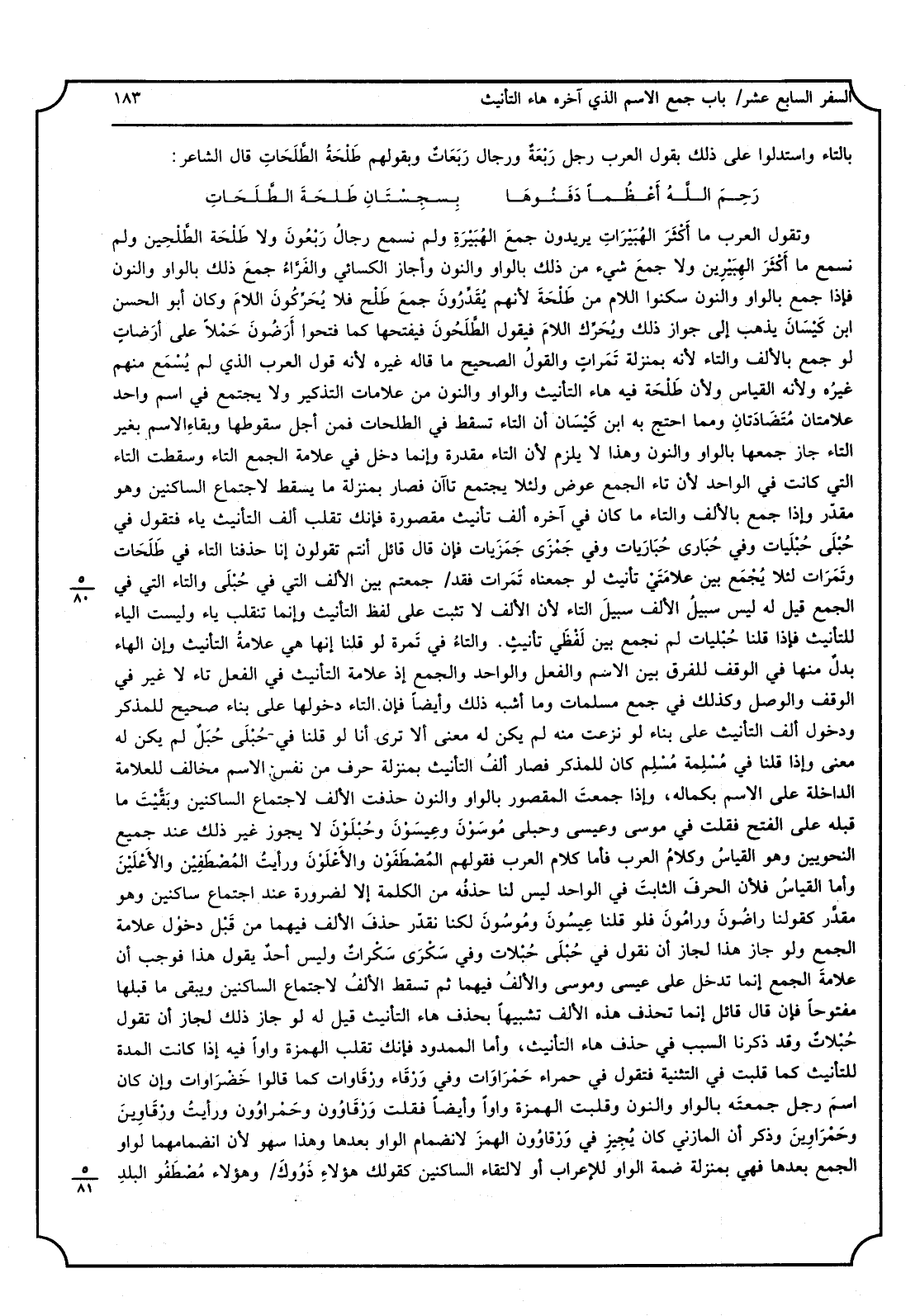 وَتقول الْعَرَب مَا أَكْثَرَ الهُبَيْرَاتِ يُرِيدُونَ جمع الهَبَيْرَةِ وَلم نسْمع رجال رَبْعُونَ وَلَا طَلْحَة الطَّلْحِين وَلم نسْمع مَا أَكْثَرَ الهِبَيْرِين وَلَا جمعَ شَيْء من ذَلِك بِالْوَاو وَالنُّون وَأَجَازَ الْكسَائي والفَرَّاءُ جمعَ ذَلِك بِالْوَاو وَالنُّون فَإِذا جمع بِالْوَاو وَالنُّون سكنوا اللَّام من طَلْحَةَ لأَنهم يُقَدِّرُونَ جمعَ طَلْح فَلَا يُحَرِّكُونَ اللامَ وَكَانَ أَبُو الْحسن ابْن كَيْسَانَ يذهب إِلَى جَوَاز ذَلِك ويُحَرِّك اللامَ فَيَقُول الطَّلَحُونَ فيفتحها كَمَا فتحُوا أَرْضُونَ حَمْلاً على أرَضياتٍ لَو جمع بِالْألف وَالتَّاء لِأَنَّهُ بِمَنْزِلَة تَمَراتٍ والقولُ الصَّحِيح مَا قَالَه غَيره لِأَنَّهُ قَول الْعَرَب الَّذِي لم يُسْمَع مِنْهُم غيرُه وَلِأَنَّهُ الْقيَاس وَلِأَن طَلْحَة فِيهِ هَاء التَّأْنِيث وَالْوَاو وَالنُّون من عَلَامَات التَّذْكِير وَلَا يجْتَمع فِي اسْم وَاحِد علامتان مُتَضَادَتانِ وَمِمَّا احْتج بِهِ ابْن كَيْسَان أَن التَّاء تسْقط فِي الطلحات فَمن أجل سُقُوطهَا وبقاءِ الِاسْم بِغَيْر التَّاء جَازَ جمعهَا بِالْوَاو وَالنُّون وَهَذَا لَا يلْزم لِأَن التَّاء مقدرَة وَإِنَّمَا دخل فِي عَلامَة الْجمع التَّاء وَسَقَطت التَّاء الَّتِي كَانَت فِي الْوَاحِد لِأَن تَاء الْجمع عوض وَلِئَلَّا يجْتَمع تاآن فَصَارَ بِمَنْزِلَة مَا يقسط لِاجْتِمَاع الساكنين وَهُوَ مقدّر وَإِذا جمع بِالْألف وَالتَّاء مَا كَانَ فِي آخِره ألف تَأْنِيث مَقْصُورَة فَإنَّك تقلب ألف التَّأْنِيث يَاء فَتَقول فِي حُبْلَى حُبْلَيات وَفِي حُبَارى حُبَارَيات وَفِي جَمْزَى جَمَزَيات فَإِن قَالَ قَائِل أَنْتُم تَقولُونَ إِنَّا حذفنا التَّاء فِي طَلَحات وتَمَرَات لِئَلَّا يُجْمَع بَين علامَتَيْ تَأْنِيث لَو جمعناه تَمَرات فقد جمعتم بَين الْألف الَّتِي فِي حُبْلَى وَالتَّاء الَّتِي فِي الْجمع قيل لَهُ لَيْسَ سبيلُ الْألف سبيلَ التَّاء لِأَن الْألف لَا تثبت على لفظ التَّأْنِيث وَإِنَّمَا تنْقَلب يَاء وَلَيْسَت الْيَاء للتأنيث فَإِذا قُلْنَا حُبْليات لم نجمع بَين لَفْظَي تأنيثٍ والتاءُ فِي تَمرة لَو قُلْنَا إِنَّهَا هِيَ علامةُ التَّأْنِيث وَإِن الْهَاء بدلٌ مِنْهَا فِي الْوَقْف للْفرق بَين الِاسْم وَالْفِعْل وَالْوَاحد وَالْجمع إِذْ عَلامَة التَّأْنِيث فِي الْفِعْل تَاء لَا غير فِي الْوَقْف والوصل وَكَذَلِكَ فِي جمع مسلمات وَمَا أشبه ذَلِك وَأَيْضًا فَإِن التَّاء دُخُولهَا على بِنَاء صَحِيح للمذكر وَدخُول ألف التَّأْنِيث على بِنَاء لَو نزعت مِنْهُ لم يكن لَهُ معنى أَلا ترى أَنا لَو قُلْنَا فِي حُبْلَى حُبَلٌ لم يكن لَهُ معنى وَإِذا قُلْنَا فِي مُسْلِمة مُسْلِم كَانَ للمذكر فَصَارَ ألفُ التَّأْنِيث بِمَنْزِلَة حرف من نفس الِاسْم مُخَالف للعلامة الدَّاخِلَة على الِاسْم بِكَمَالِهِ وَإِذا جمعتَ الْمَقْصُور بِالْوَاو وَالنُّون حذفت الْألف لِاجْتِمَاع الساكنين وبَقَّيْتَ مَا قبله على الْفَتْح فَقلت فِي مُوسَى وَعِيسَى وحبلى مُوسَوْنَ وعِيسَوْنَ وحُبْلَوْنَ لَا يجوز غير ذَلِك عِنْد جَمِيع النَّحْوِيين وَهُوَ القياسُ وكلامُ الْعَرَب فَأَما كَلَام الْعَرَب فَقَوْلهم المُصْطَفَوْن والأَعْلَوْنَ وَرَأَيْت المُصْطَفيْن والأَعْلَيْنَ وَأما القياسُ فَلِأَن الحرفَ الثابتَ فِي الْوَاحِد لَيْسَ لنا حذفُه من الْكَلِمَة إِلَّا لضَرُورَة عِنْد اجْتِمَاع ساكنين وَهُوَ مقدَّر كَقَوْلِنَا راضُونَ ورامُونَ فَلَو قُلْنَا عِيسُونَ ومُوسَونَ لَكنا نقدّر حذفَ الْألف فيهمَا من قَبْل دُخُول عَلامَة الْجمع وَلَو جَازَ هَذَا لجَاز أَن نقُول فِي حُبْلَى حُبْلات وَفِي سَكْرَى سَكْراتٌ وَلَيْسَ أحدٌ يَقُول هَذَا فموجب أَن علامةَ الْجمع إِنَّمَا تدخل على عِيسَى ومُوسَى والألفُ فيهمَا ثمَّ تسْقط ال
