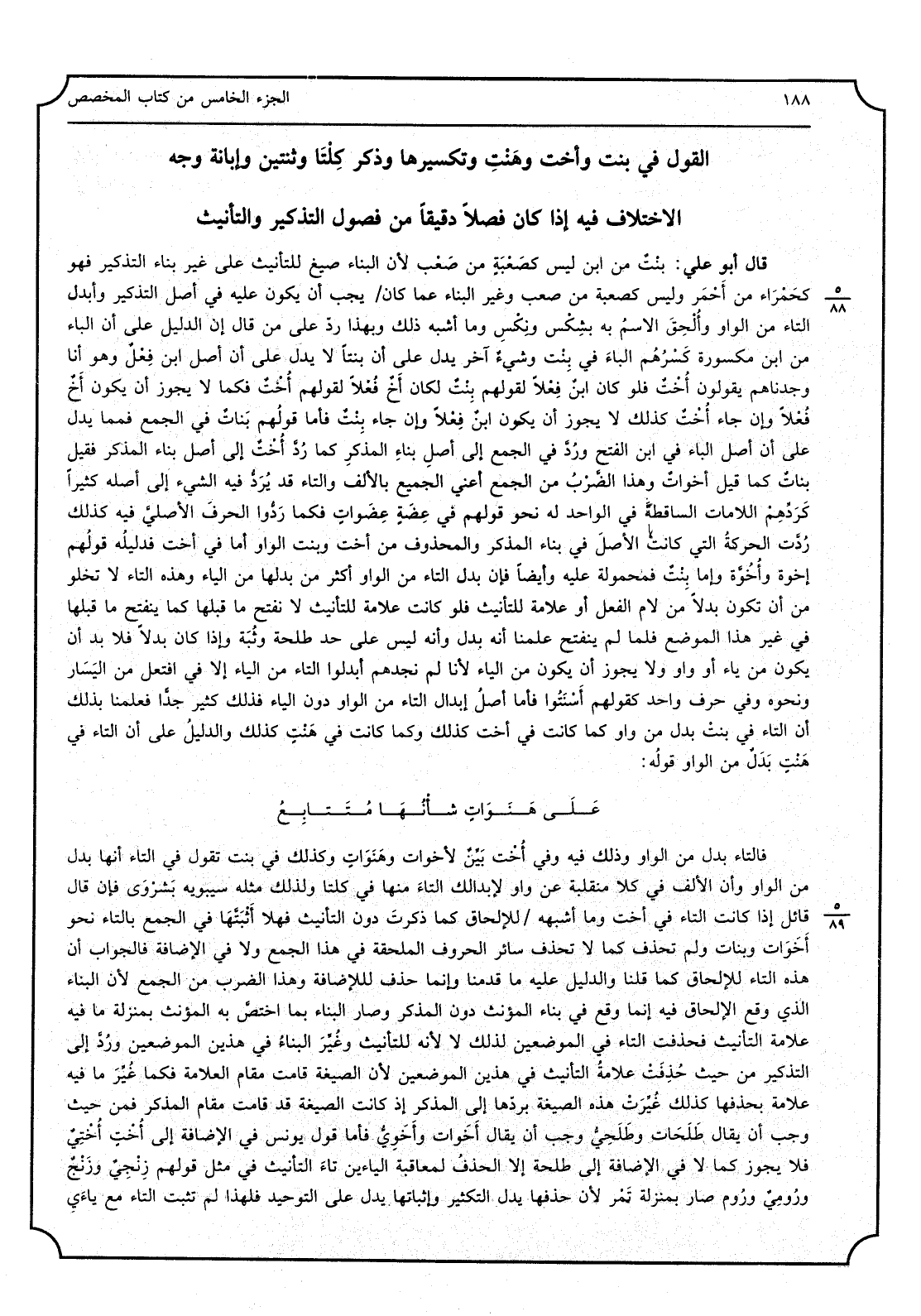 فالتاء بدل من الْوَاو وَذَلِكَ فِيهِ وَفِي أُخْت بَيِّنٌ لأخوات وهَنَوَاتٍ وَكَذَلِكَ فِي بنت تَقول فِي التَّاء أَنَّهَا بدل من الْوَاو وَأَن الْألف فِي كلا منقلبة عَن وَاو لإبدالك التاءَ مِنْهَا فِي كلتا وَلذَلِك مثله سِيبَوَيْهٍ بَشرْوَى فَإِن قَالَ قَائِل إِذا كَانَت التَّاء فِي أُخْت وَمَا أشبهه للإلحاق كَمَا ذكرتَ دون التَّأْنِيث فَلَا أَثْبَتَّهَا فِي الْجمع بِالتَّاءِ نَحْو أَخَوَات وَبَنَات وَلم تحذف كَمَا لَا تحذف سَائِر الْحُرُوف الملحقة فِي هَذَا الْجمع وَلَا فِي الْإِضَافَة فَالْجَوَاب أَن هَذِه التَّاء للإلحاق كَمَا قُلْنَا وَالدَّلِيل عَلَيْهِ مَا قدمنَا وَإِنَّمَا حذف للإضافة وَهَذَا الضَّرْب من الْجمع لِأَن الْبناء الَّذِي وَقع الْإِلْحَاق فِيهِ إِنَّمَا وَقع فِي بِنَاء الْمُؤَنَّث دون الْمُذكر وَصَارَ الْبناء بِمَا اختصَّ بِهِ الْمُؤَنَّث بِمَنْزِلَة مَا فِيهِ عَلامَة التَّأْنِيث فحذفت التَّاء فِي الْمَوْضِعَيْنِ لذَلِك لَا لِأَنَّهُ للتأنيث وغُيِّرَ البناءُ فِي هذَيْن الْمَوْضِعَيْنِ ورُدَّ إِلَى التَّذْكِير من حَيْثُ حُذِفَتْ علامةُ التَّأْنِيث فِي هذَيْن الْمَوْضِعَيْنِ لِأَن الصِّيغَة قَامَت مقَام الْعَلامَة فَكَمَا غُيِّرَ مَا فِيهِ عَلامَة بحذفها كَذَلِك غُيِّرَتْ هَذِه الصِّيغَة بردّها إِلَى الْمُذكر إِذا كَانَت الصِّيغَة قد قَامَت مقَام الْمُذكر فَمن حَيْثُ وَجب أَن يُقَال طَلَحَات وطَلَحِيُّ وَجب أَن يُقَال أَخَوات وأَخَوِيُّ فَأَما قَول يُونُس فِي الْإِضَافَة إِلَى أُخْتٍ أُخْتِيٌ فَلَا يجوز كَمَا لَا فِي الْإِضَافَة إِلَى طَلْحَة إِلَّا الحذفُ لمعاقبة الياءين تاءَ التَّأْنِيث فِي مثل قَوْلهم زِنْجِيٌ وزَنْجٌ ورُومِيٌ ورُوم صَار بِمَنْزِلَة تَمْر لِأَن حذفهَا يدل التكثير وإثباتها يدل على التَّوْحِيد فَلهَذَا لم تثبت التَّاء مَعَ ياءَيِ