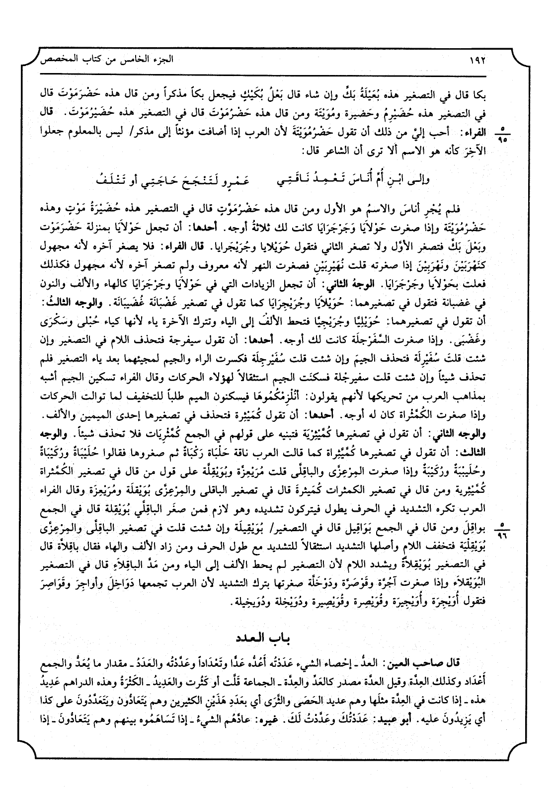 فَلم يُجْرِ أناسَ والاسمُ هُوَ الأول وَمن قَالَ هَذِه حَضْرُمَوَّتٍ قَالَ فِي التصغير هَذِه حُضَيْرَةُ مَوْتٍ وَهَذِه حَضْرَمُوَيْتَة وَإِذا صغرت حَوْلاَيَا وَجَرْجَرَايَا كَانَت لَك ثلاثةُ أوجه أَحدهَا: أَن تجْعَل حَوْلاَيَا بِمَنْزِلَة حَضْرَمَوْت وبَعْلَ بَكَّ فتصغر الأوَّل وَلَا تصغر الثَّانِي فَتَقول حُوَيْلايا وجُرَيْجَرايا قَالَ الْفراء: فَلَا يصغر آخِره لِأَنَّهُ مَجْهُول كنَهْرَبَيْنَ ونَهْرَبِيْنَ إِذا صغرته قلت نُهَيْرِبَيْنِ فصغرت النَّهر لِأَنَّهُ مَعْرُوف وَلم تصغر آخِره لِأَنَّهُ مَجْهُول فَكَذَلِك فعلت بحَوْلاَيا وجَرْجَرَايَا الوجهُ الثَّانِي: أَن تجْعَل الزِّيَادَات الَّتِي فِي حَوْلاَيَا وجَرْجَرَايَا كالهاء وَالْألف وَالنُّون فِي غضبانة فَتَقول فِي تصغيرهما: حُوَيْلاَيَا وجُرَيْجِرَايَا كَمَا تَقول فِي تَصْغِير غَضْبَانَة غُضَيبَانَة وَالْوَجْه الثالثُ: أَن تَقول فِي تصغيرهما: حُوَيْلِيَّا وجُرَيْجِيَّا فتحط الألْفَ إِلَى الْيَاء وتترك الْآخِرَة يَاء لِأَنَّهَا كياء حُبْلى وسَكْرَى وغَضْبَى وَإِذا صغرت السَّفَرْجلَة كَانَت لَك أوجه أَحدهَا: أَن تَقول سيفرجة فتحذف اللَّام فِي التصغير وَإِن شِئْت قلتَ سُفَيْرِلَة فتحذف الجيمَ وَإِن شِئْت قلت سُفَيْرجِلَة فَكسرت الرَّاء وَالْجِيم لمجيئهما بعد يَاء التصغير فَلم تحذف شَيْئا وَإِن شِئْت قلت سفيرجْلة فسكنَت الْجِيم استثقالاً لهَؤُلَاء الحركات وَقَالَ الْفراء تسكين الْجِيم أشبه بمذاهب الْعَرَب من تحريكها لأَنهم يَقُولُونَ: أنُلْزِمْكُمُوهَا: فيسكنون الْمِيم طلبا للتَّخْفِيف لما توالت الحركات وَإِذا صغرت الكُمَّثْراة كَانَ لَهُ أوجه أَحدهَا: أَن تَقول كُمَيْثِرة فتحذف فِي تصغيرها إِحْدَى الميمين وَالْألف وَالْوَجْه الثَّانِي: أَن تَقول فِي تصغيرها كُمَّيْثِرْيَة فتبنيه على قَوْلهم فِي الْجمع كُمَّثْرِيَات فَلَا تحذف شَيْئا وَالْوَجْه الثَّالِث: أَن تَقول فِي تصغيرها كُمَّيَّثِراة كَمَا قَالَت الْعَرَب نَاقَة حَلْبَاة رَكْبَاةٌ ثمَّ صغروها فَقَالُوا حُلَيْبَاةٌ ورُكَيْبَاةٌ وحُلَيبْبَةٌ ورُكَيْبَةٌ وَإِذا صغرت المِرْعِزَّى والباقِلَّى قلت مُرَيْعِزَّة وبُوَيْقِلَّة على قَول من قَالَ فِي تَصْغِير الكُمَّثراة كُمَّيْثِرة وَمن قَالَ فِي التصغير الكمثرات كُمَيثرةَ قَالَ فِي تَصْغِير الباقلي والمِرْعِزَّى بُوَيْقلَة ومُرَيْعِزَة وَقَالَ الْفراء الْعَرَب تكره التَّشْدِيد فِي الْحَرْف يطول فيتركون تشديده وَهُوَ لَازم فَمن صغَر الباقِلَّي بُوَيْقِلة قَالَ فِي الْجمع بواقِلَ وَمن قَالَ فِي الْجمع بَوَاقِيل قَالَ فِي التصغير بُوَيْقِيلَة وَإِن شِئْت قلت فِي تَصْغِير الباقِلَّى والمِرْعِزَّى بُوَيْقِلْيَة فتخفف اللَّام وَأَصلهَا التَّشْدِيد استثقالاً للتشديد مَعَ طول الْحَرْف وَمن زَاد الْألف وَالْهَاء فَقَالَ باقِلاَّة قَالَ فِي التصغير بُوَيْقِلاَّةٌ ويشدد اللَّام لِأَن التصغير لم يحط الْألف إِلَى الْيَاء وَمن مَدَّ الباقِلاَءِ قَالَ فِي التصغير البُوَيْقلاَء وَإِذا صغرت آجُرَّة وقَوْصَرَّة ودَوْخَلَّة صغرتها بترك التَّشْدِيد لِأَن الْعَرَب تجمعاه دَوَاخِلَ وأواجِرَ وقَوَاصِرَ فَتَقول أُوَيْجِرضة وأُوَيْجِيرَة وقُوَيْصِرة وقُوَيْصِيرة ودُوَيْخِلة ودُوَيخِيلة