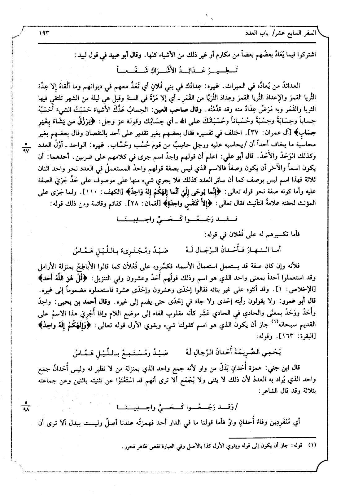 العدائدُ من يُعادُّه فِي الْمِيرَاث غَيره: عِدادُك فِي بني فُلانٍ أَي تُعَدُّ مَعَهم فِي ديوانهم وَمَا ألْقاهُ إِلا عِدَّة الثُّريا القمرَ والإِعدادَ الثُّريا القمرَ وعِدادَ الثُّرَيَّا من القَمَرِ - أَي إِلَّا مَرَّةٌ فِي السّنة وَقيل هِيَ لَيْلَة من الشَّهْر تلتقي فِيهَا الثريا والقَمَر وَبِه مَرَضٌ عِدَادٌ مِنْهُ وَقد قدَّمْتُه وَقَالَ صَاحب الْعين: الحِسابُ عَدُّكَ الأشياءَ حَسَبْتُ الشيءَ أَحْسَبُهُ حِساباً وحِسَابَةً وحِسْبَةٌ وحُسْباناً وحُسْبَانُكَ على الله - أَي حِسَابُك وَقَوله عز وَجل: {يَرْزُقُ من يَشَاءُ بِغَيْرِ حِسَابٍ} [آل عمرَان: 37] اخْتلف فِي تَفْسِيره فَقَالَ بَعضهم بِغَيْر تَقْدِير على أحد بِالنُّقْصَانِ وَقَالَ بَعضهم بِغَيْر محاسبة مَا يخَاف أحدا أَن يحاسبه عَلَيْهِ وَرجل حاسِبٌ من قوم حُسَّب وحُسَّاب غَيره: الْوَاحِد - أوَّلُ الْعدَد وَكَذَلِكَ الوَحَدُ والأَحَدُ قَالَ أَبُو عَليّ: اعْلَم أَن قَوْلهم واحِدٌ اسْم جرى فِي كَلَامهم على ضَرْبَيْنِ أَحدهمَا: أَن يكون اسْما وَالْآخر أَن يكون وَصفا فالاسم الَّذِي لَيْسَ بِصفة قَوْلهم واحدٌ المستعملُ فِي الْعدَد نَحْو وَاحِد اثْنَان ثَلَاثَة فَهَذَا اسْم لَيْسَ بِوَصْف كَمَا أَن سَائِر الْعدَد كَذَلِك فَلَا يجْرِي شَيْء مِنْهَا على مَوْصُوف على حَدٍّ جَرْيَ الصّفة عَلَيْهِ وَأما كَونه صفة نَحْو قَوْله تَعَالَى: {إِنَّما يُوحَى إِلَيَّ أنَّما إِلهُكُمْ إِلهٌ وَاحِدٌ} [الْكَهْف: 110] وَلما جَرَى على الْمُؤَنَّث لحقته علامةُ التَّأْنِيث فَقَالَ تَعَالَى: {إِلاَّ كَنَفْسٍ واحِدَةٍ} [لُقْمَان: 28] كقائم وقائمة وَمن ذَلِك قَوْله: