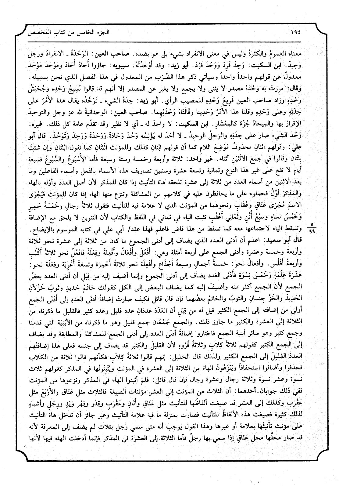 مَعْنَاهُ العمومُ والكثرةُ وَلَيْسَ فِي معنى الِانْفِرَاد بِشَيْء بل هُوَ بضده صَاحب الْعين: الوَحْدَة - الانفرادُ وَرجل وَحِيد ابْن السّكيت: وَحِدَ فَرِدَ وَوَحُدَ فَرُدَ أَبُو زيد: وَقد أَوْحَدْتُهُ سِيبَوَيْهٍ: جاؤوا أُحادُ أُحَادَ ومَوْحَدَ مَوْحَدَ معدولٌ عَن قَوْلهم وَاحِدًا وَاحِدًا وَسَيَأْتِي ذكر هَذَا الضَّرْب من المعدول فِي هَذَا الْفَصْل الَّذِي نَحن بسبيله وَقَالَ: مررتُ بِهِ وَحْدَهُ مصدر لَا يثنى وَلَا يجمع وَلَا يُغير عَن الْمصدر إِلَّا أَنهم قد قَالُوا نَسِيجُ وَحْدِه وجُحَيْشُ وَحْدِهِ وَزَاد صَاحب الْعين قَرِيعُ وَحْدِهِ للمصيب الرَّأْي أَبُو زيد: حِدَةُ الشَّيْء - تَوَحُّدُه يُقَال هَذَا الأَمْرُ على حِدَتِهِ وعَلى وَحْدِهِ وَقُلْنَا هَذَا الأَمْرُ وَحْدِينا وقَالَتَاهُ وَحْدَيْهِما صَاحب الْعين: الوحدانيةُ لله عز وَجل والتوحيدُ الإقرارُ بهَا والمِيحادُ جُزْءُ كالمِعْشَارِ ابْن السّكيت: لَا واحدَ لَهُ - أَي لَا نَظِير وَقد تقدَّم عَامَّة كل ذَلِك غَيره: وَحُدَ الشَّيْء صَار على حِدَتِهِ والرجلُ الوحيدُ - لَا أحَدَ لَهُ يُؤْنِسُه وَحُدَ وَحَادَةً وَوَحْدَةً وَوَحِدَ وَتَوَحَّدَ قَالَ أَبُو عَليّ: وَقَوْلهمْ اثنانِ محذوفُ مَوْضِعَ اللامِ كَمَا أَن قَوْلهم ابْنانِ كَذَلِك وللمؤنث اثْنَتَانِ كَمَا تَقول ابْنَتَانِ وَإِن شئتَ بِنْتَانِ وَقَالُوا فِي جمع الاثْنَيْنِ أثْنَاء غير وَاحِد: ثَلَاثَة وَأَرْبَعَة وَخَمْسَة وَسِتَّة وَسَبْعَة فَأَما الأُسْبُوعُ والسُّبُوعُ فسبعة أَيَّام لَا تقع على غير هَذَا النَّوْع وَثَمَانِية وَتِسْعَة عشرَة وَسِتِّينَ تصاريف هَذِه الْأَسْمَاء بِالْفِعْلِ وَأَسْمَاء الفاعلين وَمَا بعد الِاثْنَيْنِ من أَسمَاء الْعدَد من ثَلَاثَة إِلَى عشرَة تلْحقهُ هاءُ التَّأْنِيث إِذا كَانَ للمذكر لِأَن أصل الْعدَد وأوّله بِالْهَاءِ والمذكرُ أوَّلُ فَحَمَلُوهُ على مَا يُحَافِظُونَ عَلَيْهِ فِي كَلَامهم من المشاكلة وتنزع مِنْهَا الْهَاء إِذا كَانَ للمؤنث فيُجْرَى الاسمُ مُجْرَى عَنَاقٍ وعُقَابٍ وَنَحْوهمَا من الْمُؤَنَّث الَّذِي لَا عَلامَة فِيهِ للتأنيث فَتَقول ثلاثةُ رجالٍ وخَمْسَةُ حَمِيرٍ وَخَمْسُ نساءٍ وسبْعُ أُتُنٍ وثَمَانِي أَعْقُبٍ تثبت الْيَاء فِي ثَمَانِي فِي اللَّفْظ وَالْكتاب لِأَن التَّنْوِين لَا يلْحق مَعَ الْإِضَافَة وَتسقط الْيَاء لاجتماعها مَعَه كَمَا تسْقط من هَذَا قَاض فَاعْلَم فَهَذَا عقد أبي عَليّ فِي كِتَابه الموسوم بالإيضاح قَالَ أَبُو سعيد: اعْلَم أَن أدنى الْعدَد الَّذِي يُضَاف إِلَى أدنى الجموع مَا كَانَ من ثَلَاثَة إِلَى عشرَة نَحْو ثَلَاثَة وَأَرْبَعَة وَخَمْسَة وَعشرَة وَأدنى الْجمع على أَرْبَعَة أَمْثِلَة وَهِي: أَفْعُلٌ وأَفْعَالٌ وأَفْعِلةٌ وفِعْلَةٌ فافَعُلٌ نَحْو ثلاثةُ أَكْلُبٍ وأربعةُ أَفْلُس وأفعالٌ نَحْو: خمسةُ أجمالس وسبعةُ أَجْذَاع وأَفْعِلَة نَحْو ثلاثةُ أَحْمِرَة وتسعةُ أَغْرِبضة وفِعْلَة نَحْو: عَشْرَةُ غِلْمَةٍ وَخَمْسُ نِسْوَةٍ فأَدْنَى العَدد يُضَاف إِلَى أدنى الجموع وَإِنَّمَا أضيف إِلَيْهِ من قِبَلِ أَن أدنى الْعدَد بعضُ الْجمع لِأَن الْجمع أَكثر مِنْهُ وأضيفَ غليه كَمَا يُضَاف الْبَعْض إِلَى الْكل كَقَوْلِك خاتَمُ حَديدٍ وثوبُ خَزِّلأنِ الحَدِيدَ والخَزَّ جِنسانِ والثوبُ والخاتمُ بعضُهما فَإِن قَالَ قَائِل فَكيف صارتْ إضافةُ أدنَى العددِ إِلَى أَدْنَى الْجمع أولى من إِضَافَته إِلَى الْجمع الْكثير قيل لَهُ من قِبَلِ أَن العَدَدَ عددَانِ عدد قَلِيل وَعدد كثير فالقليل مَا ذَكرْنَاهُ من الثَّلَاثَة إِلَى الْعشْرَة إِلَى الْجمع وَالْكثير مَا جَاوز ذَلِك وَالْجمع جَمْعَان جمع قَلِيل وَهُوَ مَا ذَكرْنَاهُ من الأبْنِيَة الَّتِي قدمنَا وَجمع كثير وَهُوَ سَائِر أبنية الْجمع فَاخْتَارُوا إضافةَ أدنَى الْعدَد إِ