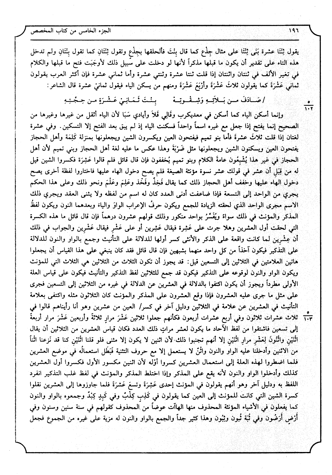 وَإِنَّمَا أسكن الْيَاء كَمَا أسكن فِي معديكرب وقَالِي وأيادي سَبَا لِأَن الْيَاء أثقل من غَيرهَا وَغَيرهَا من الصَّحِيح إِنَّمَا يفتح إِذا جعل مَعَ غَيره اسْما وَاحِدًا فسكنت الْيَاء إِذْ لم يبْق بعد الْفَتْح إِلَّا التسكين وَفِي عشرَة لُغَتَانِ إِذا قلت ثلاثَ عشرةَ فَأَما بَنو تَمِيم فيفتحون الْعين ويكسرون الشين ويجعلونها بِمَنْزِلَة كَلِمَة وَأهل الْحجاز يفتحون الْعين ويسكنون الشين ويجعلونها مثل ضَرْبَةَ وَهَذَا عكس مَا عَلَيْهِ لُغَة أهل الْحجاز وَبني تَمِيم لِأَن أهل الْحجاز فِي غير هَذَا يُشْبِعُون عامةَ الْكَلَام وَبَنُو تَمِيم يُخففون فَإِن قَالَ قَائِل فَلم قَالُوا عَشِرَة فكسروا الشين قيل لَهُ من قَبَلِ أَن عشر فِي قَوْلك عشر نسْوَة مُؤَنّثَة الصِّيغَة فَلم يَصح دُخُول الْهَاء عَلَيْهَا فَاخْتَارُوا لَفْظَة أُخْرَى يَصح دُخُول الْهَاء عَلَيْهَا وخفف أهل الْحجاز ذَلِك كَمَا قَالَ فَخِذٌ وفَخْذ وعَلِمَ وعَلْمَ وَنَحْو ذَلِك وعَلى هَذَا الحكم يجْرِي من الْوَاحِد إِلَى التِّسْعَة فَإِذا ضاعفت أدنى الْعدَد كَانَ لَهُ اسْم من لَفظه وَلَا يثنى العقد وَيجْرِي ذَلِك الِاسْم مجْرى الْوَاحِد الَّذِي لحقته الزِّيَادَة للْجمع وَيكون حرفُ الْإِعْرَاب الواوَ والياءَ وبعدهما النُّون وَيكون لفظُ الْمُذكر والمؤنث فِي ذَلِك سَوَاء ويُفَسَّرُ بِوَاحِد منكور وَذَلِكَ قَوْلهم عشرُون درهما فَإِن قَالَ قَائِل مَا هَذِه الكسرة الَّتِي لحقت أول الْعشْرين وهلا جرت على عَشِرة فَقَالَ عَشِرين أَو على عَشْرِ فَيُقَال عَشْرِين وَالْجَوَاب فِي ذَلِك أَن عِشْرِين لما كَانَت وَاقعَة على الذّكر وَالْأُنْثَى كسر أَولهَا للدلالة على التَّأْنِيث وَجمع بِالْوَاو وَالنُّون للدلالة على التَّذْكِير فَيكون آخِذا من كل وَاحِد مِنْهُمَا بشبهين فَإِن قَالَ قَائِل فقد كَانَ يَنْبَغِي على هَذَا الْقيَاس أَن يجْعَلُوا هَاتين العلامتين فِي الثَّلَاثِينَ إِلَى التسعين قيل: قد يجوز أَن تكون الثَّلَاث من الثَّلَاثِينَ هِيَ الثَّلَاث الَّتِي للمؤنث وَيكون الْوَاو وَالنُّون لوُقُوعه على التَّذْكِير فَيكون قد جمع للثلاثين لفظ التَّذْكِير والتأنيث فَيكون على قِيَاس الْعلَّة الأولى مطرداً وَيجوز أَن يكون اكتفوا بِالدّلَالَةِ فِي الْعشْرين عَن الدّلَالَة فِي غَيره من الثَّلَاثِينَ إِلَى التسعين فَجرى على مثل مَا جرى عَلَيْهِ الْعشْرُونَ فَإِذا وَقع الْعشْرُونَ على الْمُذكر والمؤنث كَانَ الثَّلَاثُونَ مثله وَاكْتفى بعلامة التَّأْنِيث فِي الْعشْرين عَن عَلامَة فِي الثَّلَاثِينَ وَدَلِيل آخر فِي كسر الْعين من عشْرين وَهُوَ أَنا رأيناهم قَالُوا فِي ثَلَاث عشرات ثَلَاثُونَ وَفِي أَربع عشرات أَرْبَعُونَ فكأنهم جعلُوا ثَلَاثِينَ عَشْرَ مرارٍ ثَلَاثَة وَأَرْبَعين عَشْرَ مرار أربعةٌ إِلَى تسعين فاشتقوا من لفظ الْآحَاد مَا يكون لعشر مراتٍ ذَلِك الْعدَد فَكَانَ قِيَاس الْعشْرين من الثَّلَاثِينَ أَن يُقَال اثْنَيْنِ واثْنُونَ لِعَشْر مرارِ اثنَيْنِ إِلَّا أَنهم تجنبوا ذَلِك لِأَن اثْنَيْنِ لَا يكون إِلَّا مثنى فَلَو قُلْنَا اثْنَيْنِ كُنَّا قد نَزعنا اثْناً من الِاثْنَيْنِ وأدخلنا عَلَيْهِ الْوَاو وَالنُّون واثْنٌ لَا يسْتَعْمل إِلَّا مَعَ حُرُوف التَّثْنِيَة فَبَطَل استعمالُه فِي مَوضِع الْعشْرين فَلَمَّا اضطروا لهَذِهِ الْعلَّة إِلَى اسْتِعْمَال الْعشْرين كسروا أوّله لِأَن اثْنَيْنِ مكسور الأول فكسروا أول الْعشْرين كَذَلِك وأدخلوا الْوَاو وَالنُّون لِأَنَّهُ يَقع على الْمُذكر وَإِذا اخْتَلَط الْمُذكر والمؤنث فِي لفظ غلب التَّذْكِير انْفَرد اللَّفْظ بِهِ وَدَلِيل آخر وَهُوَ أَنهم يَقُولُونَ فِي الْمُؤَنَّث إِحْدَى عَشِرَةَ وتسعَ عَشْرَةَ فَلَمَّا جاوزها إِلَى الْعشْرين نقلوا كسرة الشين الَّتِي كَانَت للمؤنث إِلَى الْعين كَمَا يَقُو