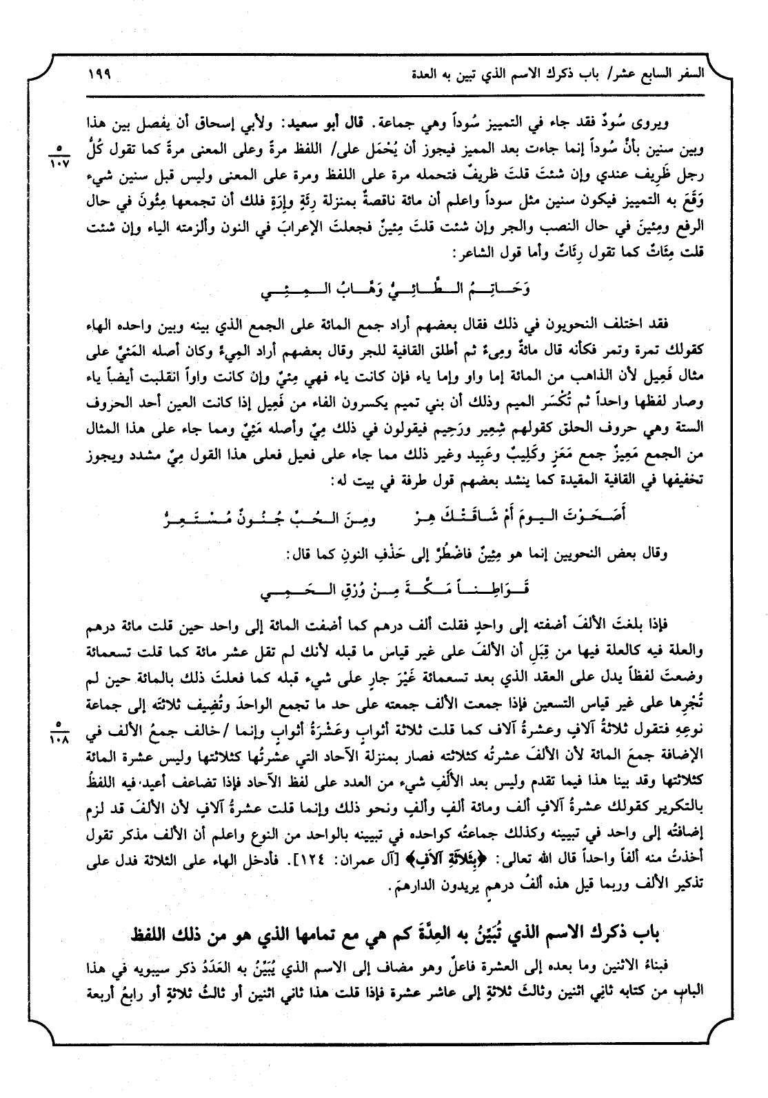 ويروى سُودٌ فقد جَاءَ فِي التَّمْيِيز سُوداً وَهِي جمَاعَة قَالَ أَبُو سعيد: وَلأبي إِسْحَاق أَن يفصل بَين هَذَا وَبَين سِنِين بأنَّ سُوداً إِنَّمَا جَاءَت بعد الْمُمَيز فَيجوز أَن يُحْمَل على اللَّفْظ مرةٌ وعَلى الْمَعْنى مرةٌ كَمَا تَقول كُلُّ رجل ظَرِيف عِنْدِي وَإِن شئتَ قلتَ ظريفٌ فتحمله مرّة على اللَّفْظ وَمرَّة على الْمَعْنى وَلَيْسَ قبل سِنِين شَيْء وَقَعَ بِهِ التَّمْيِيز فَيكون سِنِين مثل سُودًا وَاعْلَم أَن مائَة ناقصةٌ بِمَنْزِلَة رِئَةٍ وإِرَةٍ فلك أَن تجمعها مِئُونَ فِي حَال الرّفْع ومِئينَ فِي حَال النصب والجر وَإِن شئتَ قلتَ مِئينٌ فجعلتَ الإعرابَ فِي النُّون وألزمته الْيَاء وَإِن شِئْت قلت مِئَاتٌ كَمَا تَقول رِئَاتٌ وَأما قَول الشَّاعِر: