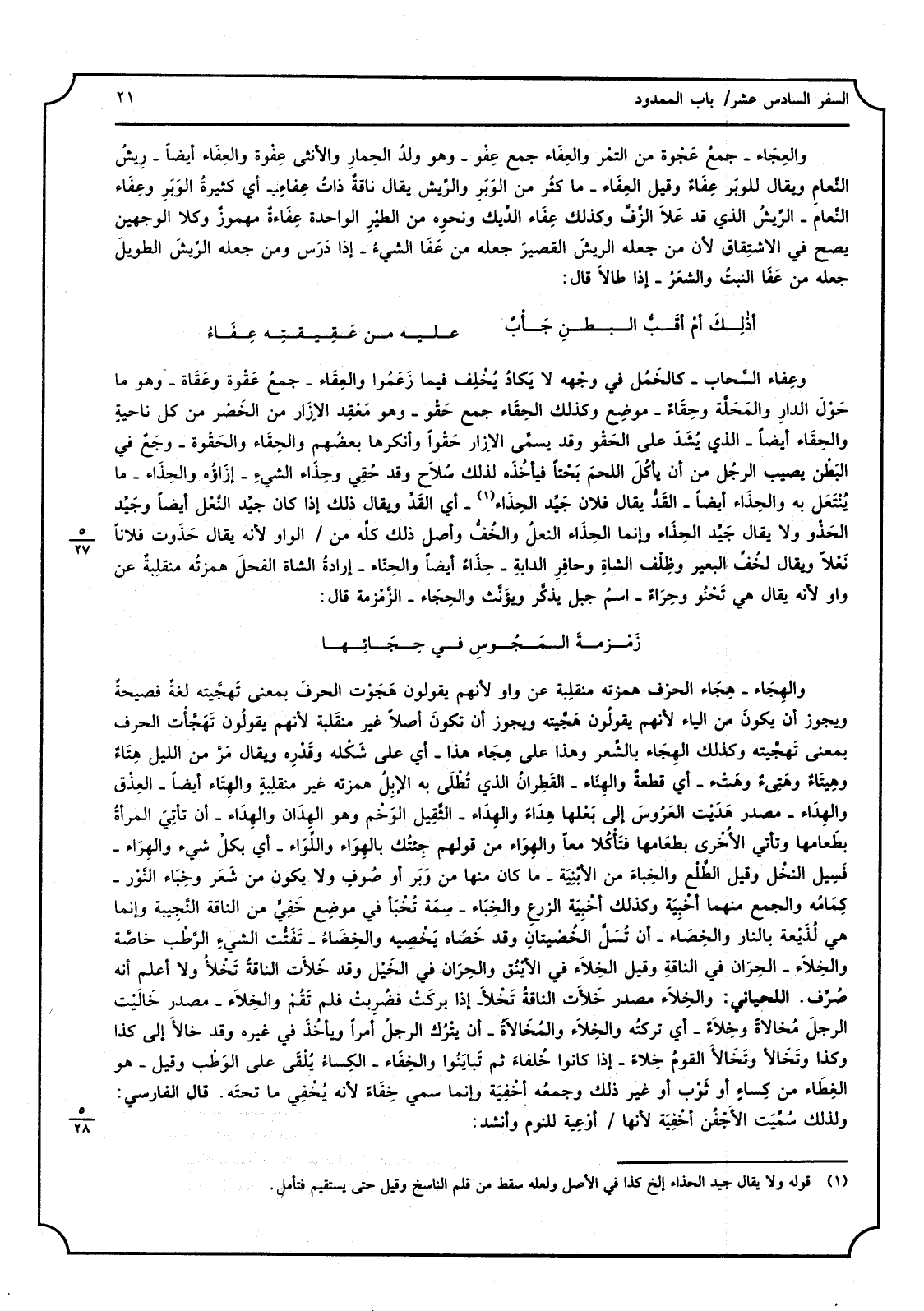 وعِفاء السَّحاب - كالخَمُل فِي وجْهه لَا يَكادُ يُخْلِف فِيمَا زَعَمُوا والعِقَّاء - جمعُ عَقْوة وعَقَاة - وَهُوَ مَا حَوْلَ الدارِ والمَحَلَّة وحِقَاءٌ - موضِع وَكَذَلِكَ الحِقَاء جمع حَقْو - وَهُوَ مَعقِد الاِزَار من الخَصْر من كل ناحيةٍ والحِقَاء أَيْضا - الَّذِي يُشَدّ على الحَقْو وَقد يسمَّى الاِزار حَقْواً وأنكرها بعضُهم والحِقَاء والحَقْوة - وجَعٌ فِي البَطْن يُصِيب الرجُل من أَن يأكُلَ اللحمَ بَحْتاً فيأخُذَه لذَلِك سُلاَح وَقد حُقِي وحِذَاء الشيءِ - إزَاؤُه والحذَاء - مَا يُنْتَعَل بِهِ والحِذَاء أَيْضا - القَدُّ يُقَال فلَان جَيِّد الحِذَاء - أَي القَدِّ وَيُقَال ذَلِك إِذا كَانَ جيِّد النَّعْل أَيْضا وجِيِّد الحَذْو وَلَا يُقَال جَيِّد الحِذَاء وَإِنَّمَا الحِذَاء النعلُ والخُفُّ وأصل ذَلِك كلِّه من الْوَاو لِأَنَّهُ يُقَال حَذَوت فلَانا نَعْلاً وَيُقَال لخُفِّ الْبَعِير وظِلْف الشاةِ وحافِرِ الدابةِ - حِذَاءٌ أَيْضا والحِنّاء - إرادةُ الشَّاة الفحلَ همزتُه منقلِبةٌ عَن وَاو لِأَنَّهُ يُقَال هِيَ تَحْنُو وحِرَاءٌ - اسمُ جبل يذكَّر ويؤَنَّث والحِجَاء - الزَّمْزمة قَالَ: