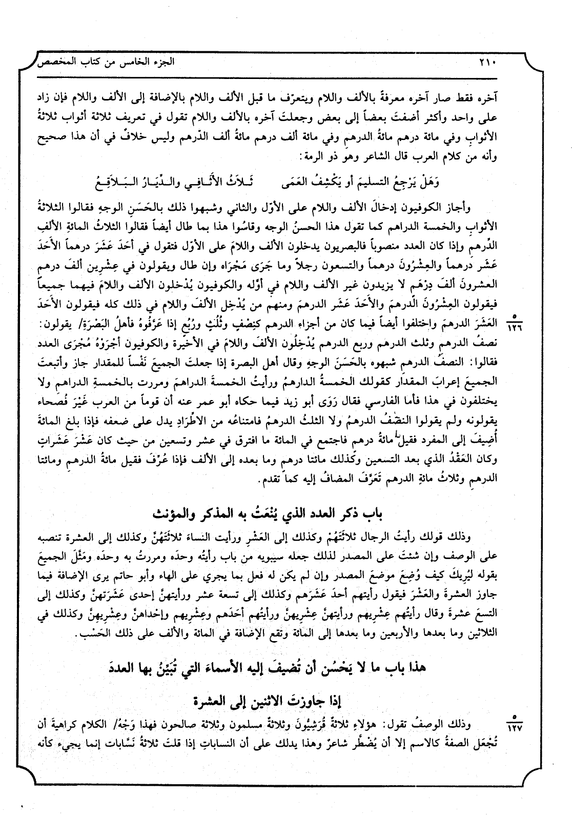 وَأَجَازَ الْكُوفِيُّونَ إدخالَ الْألف وَاللَّام على الأوّل وَالثَّانِي وشبهوا ذَلِك بالحَسَنِ الْوَجْه فَقَالُوا الثلاثةُ الأثوابِ والخمسة الدَّرَاهِم كَمَا تَقول هَذَا الحسنُ الْوَجْه وقاسُوا هَذَا بِمَا طَال أَيْضا فَقَالُوا الثلاثُ المائةِ الألفِ الدِّرهمِ وَإِذا كَانَ الْعدَد مَنْصُوبًا فالبصريون يدْخلُونَ الْألف وَاللَّام على الأوّل فَتَقول فِي أحَدَ عَشَرَ درهما الأَحَدَ عَشَر درهما والعِشْرُونَ درهما وَالتِّسْعُونَ رجلا وَمَا جَرَى مَجْرَاه وَإِن طَال وَيَقُولُونَ فِي عِشْرِين ألفَ درهمٍ العشرونَ ألفَ دِرْهَمٍ لَا يزِيدُونَ غير الْألف وَاللَّام فِي أوَّله والكوفيون يُدْخِلون الْألف واللامَ فيهمَا جمعياً فَيَقُولُونَ العِشْرُونَ الدرهمَ والأَحَدَ عَشَر الدرهمَ وَمِنْهُم من يُدْخِل الألفَ وَاللَّام فِي ذَلِك كُله فَيَقُولُونَ الأَحَدَ العَشَرَ الدرهمَ وَاخْتلفُوا أَيْضا فِيمَا كَانَ من أَجزَاء الدِّرْهَم كنِصْفٍ وثُلْثٍ ورُبُع إِذا عَرَّفُوهُ فأهلُ البَصْرَةِ يَقُولُونَ: نصفُ الدرهمِ وَثلث الدِّرْهَم وَربع الدِّرْهَم يُدْخِلُون الألفَ واللامَ فِي الْأَخِيرَة والكوفيون أجْرَوْهُ مُجْرَى الْعدَد فَقَالُوا: النصفُ الدِّرْهَم شبهوه بالحَسَنَ الوجهِ وَقَالَ أهل الْبَصْرَة إِذا جعلتَ الجميعَ نَفْساً للمقدار جَازَ وأتبعتَ الجميعَ إعرابَ الْمِقْدَار كَقَوْلِك الخمسةُ الدراهمُ ورأيتُ الخمسةَ الدراهمَ ومررت بالخمسةِ الدراهمِ وَلَا يَخْتَلِفُونَ فِي هَذَا فَأَما الْفَارِسِي فَقَالَ رَوَى أَبُو زيد فِيمَا حَكَاهُ أَبُو عمر عَنهُ أَن قوما من الْعَرَب غَيْرَ فُصحاء يَقُولُونَهُ وَلم يَقُولُوا النصفُ الدرهمُ وَلَا الثلثُ الدرهمُ فامتناعُه من الاطِّرَادِ يدل على ضعفه فَإِذا بلغ المائةَ أُضِيفَ إِلَى الْمُفْرد فَقيل مائةُ دِرْهَم فَاجْتمع فِي الْمِائَة مَا افترق فِي عشر وَتِسْعين من حَيْثُ كَانَ عَشْرَ عَشَراتٍ وَكَانَ العَقْدُ الَّذِي بعد التسعين وَكَذَلِكَ مِائَتَا دِرْهَم وَمَا بعده إِلَى الْألف فَإِذا عُرِّفَ فَقيل مائةُ الدرهمِ وَمِائَتَا الدرهمِ وثلاثُ مائةِ الدِّرْهَم تَعَرَّفَ المضافُ إِلَيْهِ كَمَا تقدم
