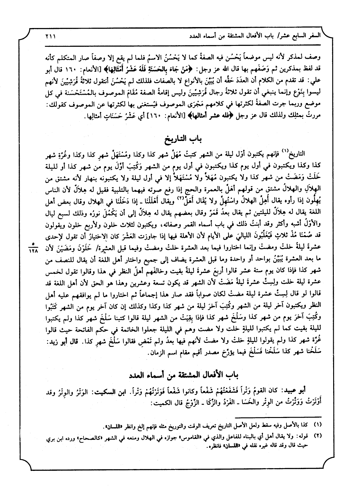 التَّارِيخ فَإِنَّهُم يَكْتُبُونَ أوّل لَيْلَة من الشَّهْر كتبتُ مُهَلَّ شهر كَذَا ومُسْتَهَلَّ شهرِ كَذَا وَكَذَا وغُرَّةِ شهر كَذَا وَكَذَا ويكتبون فِي أول يَوْم كَذَا ويكتبون فِي أول يَوْم من الشَّهْر وَكُتِبَ أوَّلَ يَوْم من شهر كَذَا أَو لليلة خَلَتْ وَمَضَتْ من شهر كَذَا وَلَا يَكْتُبُونَ مُهَلاًّ وَلَا مُسْتَهَلاًّ إِلَّا فِي أول لَيْلَة وَلَا يكتبونه بنهار لِأَنَّهُ مُشْتَقّ من الهلاَلِ والهلالُ مُشْتَقّ من قَوْلهم أهَلَّ بِالْعُمْرَةِ وَالْحج إِذا رفع صَوته فيهمَا بِالتَّلْبِيَةِ فَقيل لَهُ هِلاَلٌ لِأَن النَّاس يُهِلُّون إِذا رَأَوْهُ يُقَال أُهِلَّ الهلالُ واسْتُهِلَّ وَلَا يُقَال أَهَلَّ وَيُقَال أَهْلَلْنَا - إِذا دَخَلْنَا فِي الْهلَال وَقَالَ بعض أهل اللُّغَة يُقَال لَهُ هِلاَلٌ لليلتين ثمَّ يُقَال بعدُ قَمَرٌ وَقَالَ بَعضهم يُقَال لَهُ هِلاَلٌ إِلَى أَن يَكْمُلَ نورُه وَذَلِكَ لسبع لَيَال والأوّلُ أشبه وَأكْثر وَقد أبنتُ ذَلِك فِي بَاب أَسمَاء الْقَمَر وَصِفَاته، ويكتبون لثلاث خلون ولأربع خلون وَيَقُولُونَ قد صُمْنَا مُذْ ثلاثٍ فَيُغَلِّبَونَ اللياليَ على الْأَيَّام لِأَن الْأَهِلّة فِيهَا إِذا جَاوَزت العَشْرَ خَلَوْنَ ومَضَيْنَ لِأَن مَا بعد الْعشْرَة يُبَيِّنُ بِوَاحِد أَو وَاحِدَة وَمَا قبل الْعشْرَة يُضَاف إِلَى جَمِيع وَاخْتَارَ أهل اللُّغَة أَن يُقَال لِلنِّصْفِ شهر كَذَا فَإِذا كَانَ يَوْم سِتَّة عشر قَالُوا أربعَ عشرةَ لَيْلَة بقيت وخالفَهم أهلُ النّظر فِي هَذَا وَقَالُوا تَقول لخمس عشرَة لَيْلَة خلت ولِسِتَّ عشرةَ لَيْلَة مَضَتْ لِأَن الشَّهْر قد يكون تِسْعَة وَعشْرين وَهَذَا هُوَ الْحق لِأَن أهل اللُّغَة قد قَالُوا لَو قَالَ لِسِتَّ عشرَة لَيْلَة مضتْ لَكَانَ صَوَابا فقد صَار هَذَا إِجْمَاعًا ثمَّ اخْتَارُوا مَا لم يوافقهم عَلَيْهِ أهل النّظر ويكتبون آخر لَيْلَة من الشَّهْر وكُتِبَ آخرَ لَيْلَة من شهر كَذَا وَكَذَا وَكَذَلِكَ عَن كَانَ آخر يَوْم من الشَّهْر كَتَبُوا وكُتِبَ آخرَ يَوْم من شهر كَذَا وسَلْخَ شهر كَذَا فَإِذا بِقِيَتْ من الشَّهْر لَيْلَة قَالُوا كتبنَا سَلْخَ شهر كَذَا وَلم يكتبوا لليلة بقيت كَمَا لم يكتبوا لليلةٍ خلت وَلَا مَضَت وهم فِي اللَّيْلَة جعلُوا الخاتمة فِي حكم الْفَاتِحَة حَيْثُ قَالُوا غُرَّة شهر كَذَا وَلم يَقُولُوا لليلةٍ خلتْ وَلَا مضتْ لأَنهم فِيهَا بعدُ وَلم تَمْصِ فَقَالُوا سَلْخَ شهرِ كَذَا قَالَ أَبُو زيد: سَلَخْنا شهر كَذَا سَلَخْنا فَسَلْخَ فِيمَا يؤرَّخ مصدر أقيم مقَام اسْم الزَّمَان