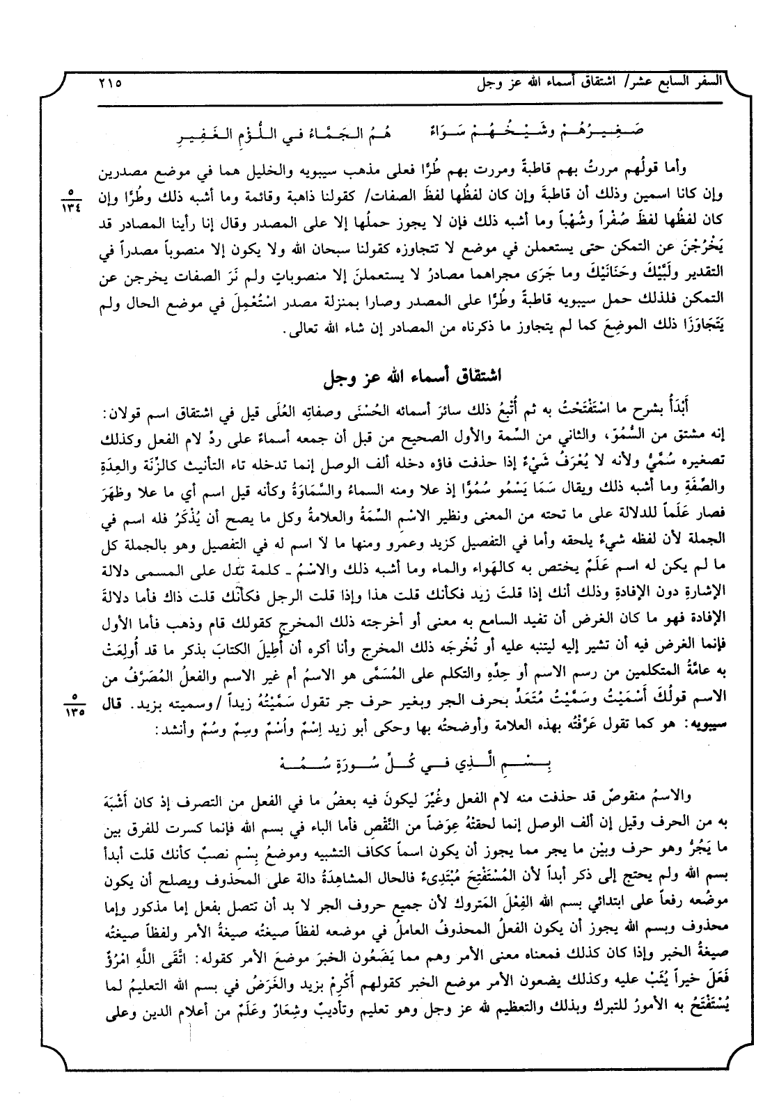أَبْدَأُ بشرح مَا اسْتَفْتَحْتُ بِهِ ثمَّ أُتْبعُ ذَلِك سائرَ أَسْمَائِهِ الحُسْنَى وصفاتِه العُلَى قيل فِي اشتقاق اسْم قَولَانِ: إِنَّه مُشْتَقّ من السُّمُوّ، وَالثَّانِي من السِّمة وَالْأول الصَّحِيح من قبل أَن جمعه أسماءٌ على ردِّ لَام الْفِعْل وَكَذَلِكَ تصغيره سُمَّيُّ وَلِأَنَّهُ لَا يُعْرَفُ شَيْءٌ إِذا حذفت فاؤه دخله ألف الْوَصْل إِنَّمَا تدخله تَاء التَّأْنِيث كالزِّنَة والعِدَةِ والصِّفَةِ وَمَا أشبه ذَلِك وَيُقَال سَمَا يَسْمُو سُمُوًّا إِذا علا وَمِنْه السماءُ والسَّمَاوَةُ وَكَأَنَّهُ قيل اسْم أَي مَا علا وظهَرَ فَصَارَ عَلَماً للدلالة على مَا تَحْتَهُ من الْمَعْنى وَنَظِير الاسْمِ السِّمَةُ والعلامةُ وكل مَا يَصح أَن يُذْكَرُ فَلهُ اسْم فِي الْجُمْلَة لِأَن لَفظه شيءٌ يلْحقهُ وَأما فِي التَّفْصِيل كزيد وَعَمْرو وَمِنْهَا مَا لَا اسْم لَهُ فِي التَّفْصِيل وَهُوَ بِالْجُمْلَةِ كل مَا لم يكن لَهُ اسْم عَلَمٌ يخْتَص بِهِ كالهَواء وَالْمَاء وَمَا أشبه ذَلِك والاسْمُ - كلمة تدل على الْمُسَمّى دلَالَة الإشارةِ دون الإفادةِ وَذَلِكَ أَنَّك إِذا قلتَ زيد فكأنك قلت هَذَا وَإِذا قلت الرجل فكأنك قلت ذَاك فَأَما دلالةَ الإفادة فَهُوَ مَا كَانَ الْغَرَض أَن تفِيد السَّامع بِهِ معنى أَو أخرجته ذَلِك الْمخْرج كَقَوْلِك قَامَ وَذهب فَأَما الأول فَإِنَّمَا الْغَرَض فِيهِ أَن تُشِير إِلَيْهِ ليتنبه عَلَيْهِ أَو تُخْرجَه ذَلِك الْمخْرج وَأَنا أكره أَن أُطِيلَ الكتابَ بِذكر مَا قد أُولِعَتْ بِهِ عامَّةٌ الْمُتَكَلِّمين من رسم الِاسْم أَو حِدِّةِ والتكلم على المُسَمَّى هُوَ الاسمُ أم غير الِاسْم والفعلُ المُصَرَّفُ من الِاسْم قولُكَ أَسْمَيْتُ وسَمَّيْتُ مُتَعَدٍّ بِحرف الْجَرّ وَبِغير حرف جر تَقول سَمَّيْتُهُ زيدا وسميته بزيد قَالَ سِيبَوَيْهٍ: هُوَ كَمَا تَقول عَرَّفْتُه بِهَذِهِ الْعَلامَة وأوضحتُه بهَا وَحكى أَبُو زيد اِسْمٌ واُسْمٌ وسِمٌ وسُمٌ وَأنْشد: